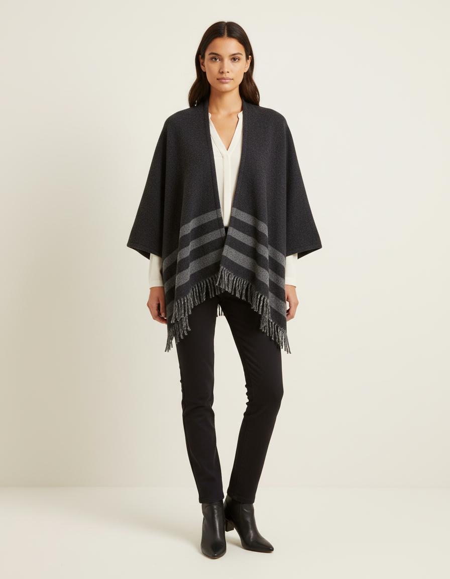 Description : Veste esprit poncho GILLA. Confectionnée en laine mélangée, la veste de style poncho se pare de délicates rayures contrastantes dans le bas. Elle est en outre dotéeÂ: de manches 3/4, de poches fendues sur les côtés ainsi que de franges sur le devant. Elle vous conférera style et confort tout au long de la saisonÂ!Le mannequin mesure 173cm et porte cet article en T1.