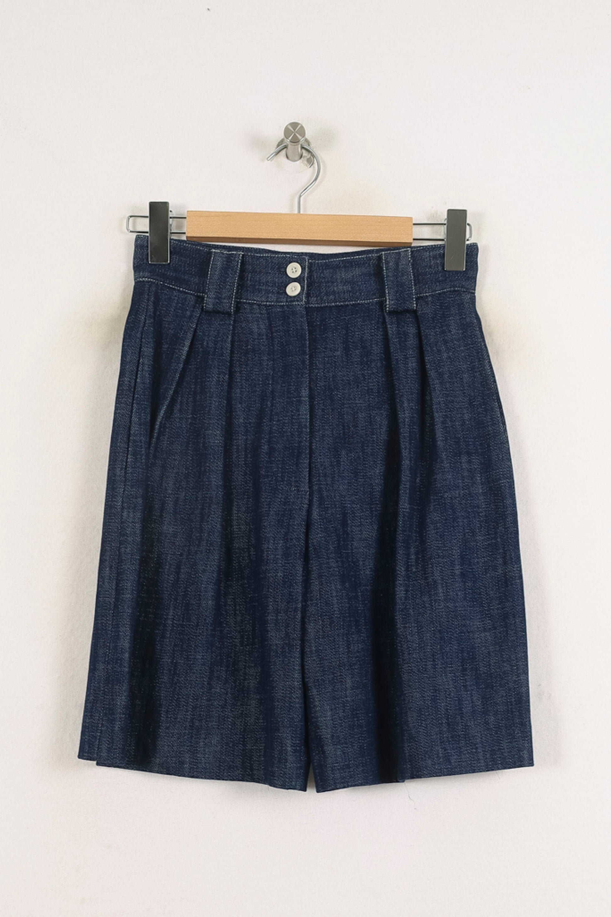 Short bleu taille S/36 de la marque Ines de la Fressange Paris, au design élégant et intemporel, parfait pour un look raffiné et décontracté. Confectionné dans une matière à l’aspect denim, ce short se distingue par ses plis marqués à l’avant, sa taille haute avec ceinture à passants, une fermeture à double bouton apparente et un revers soigné en bas de jambe, lui conférant une allure moderne et structurée. Idéal pour une promenade en ville ou un déjeuner en terrasse lors des journées estivales.