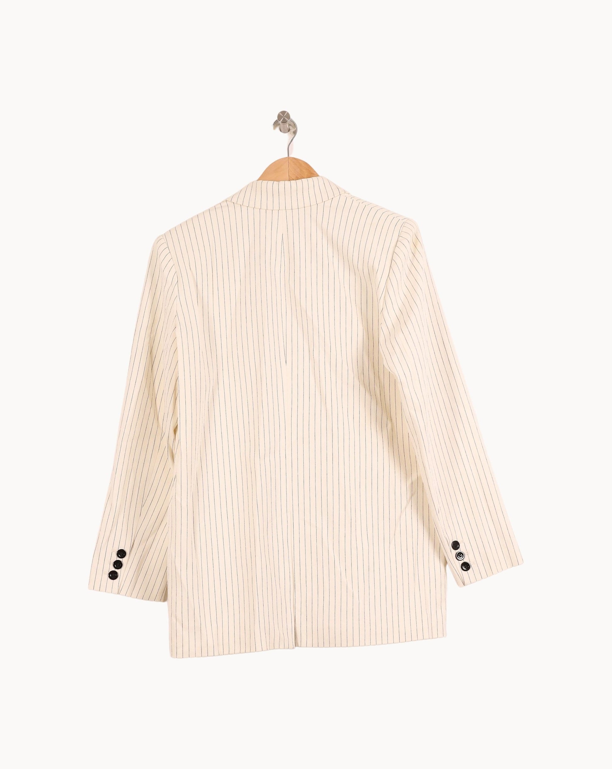 Veste blazer rayée blanc Bérénice, taille L/40, confectionnée dans une coupe moderne et élégante. Ce modèle présente un tissu à fines rayures verticales, une fermeture à un bouton et deux poches à rabat, apportant distinction et raffinement à la silhouette. Parfait pour sublimer une tenue de bureau ou apporter une touche sophistiquée à un dîner en ville.