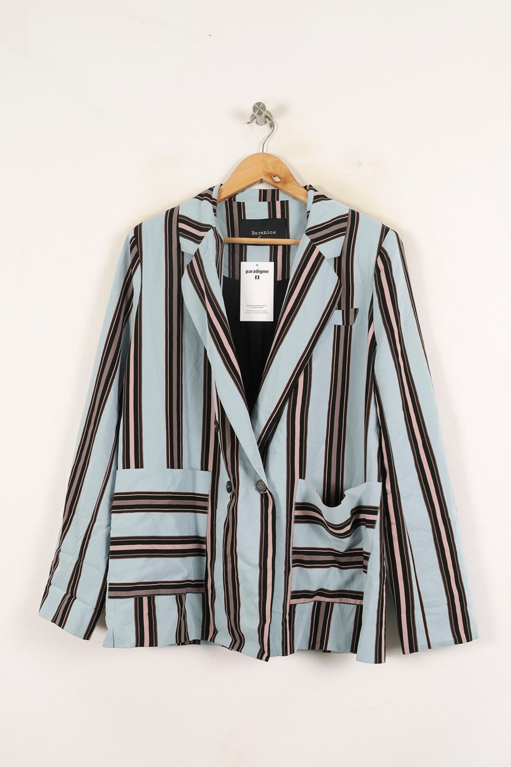 Veste Bérénice à rayures bleues, noires et rose pâle, taille S/36, idéale pour une allure sophistiquée et contemporaine. Confectionnée dans une matière fluide à la finition légèrement satinée, cette veste se distingue par son motif à larges rayures verticales et ses poches plaquées, apportant une touche graphique et moderne. Parfaite pour dynamiser une tenue de bureau ou sublimer un look de soirée décontractée.