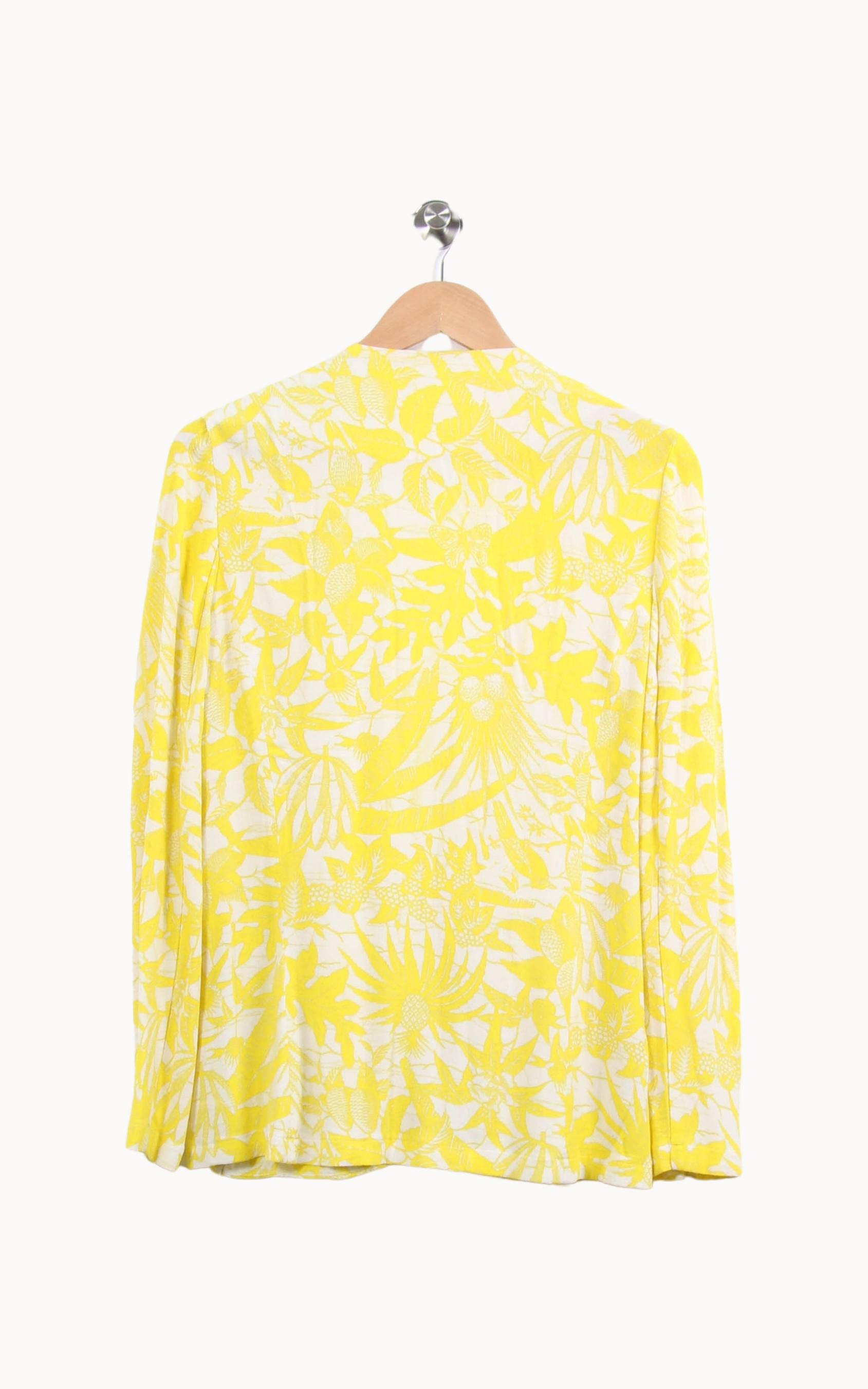 Veste motif floral jaune et blanc American Vintage, taille M/38, parfaite pour illuminer votre vestiaire. Sa matière fluide met en valeur un imprimé tropical éclatant, tandis que la coupe souple et les poches plaquées apportent confort et originalité à cette pièce unique. Idéale pour égayer une tenue lors d’un brunch estival en ville ou d’une promenade ensoleillée.