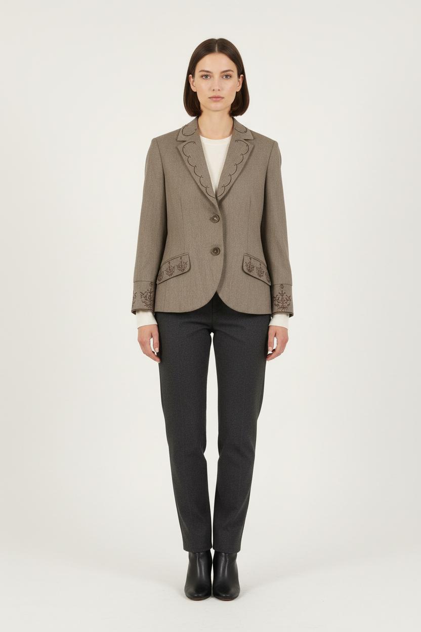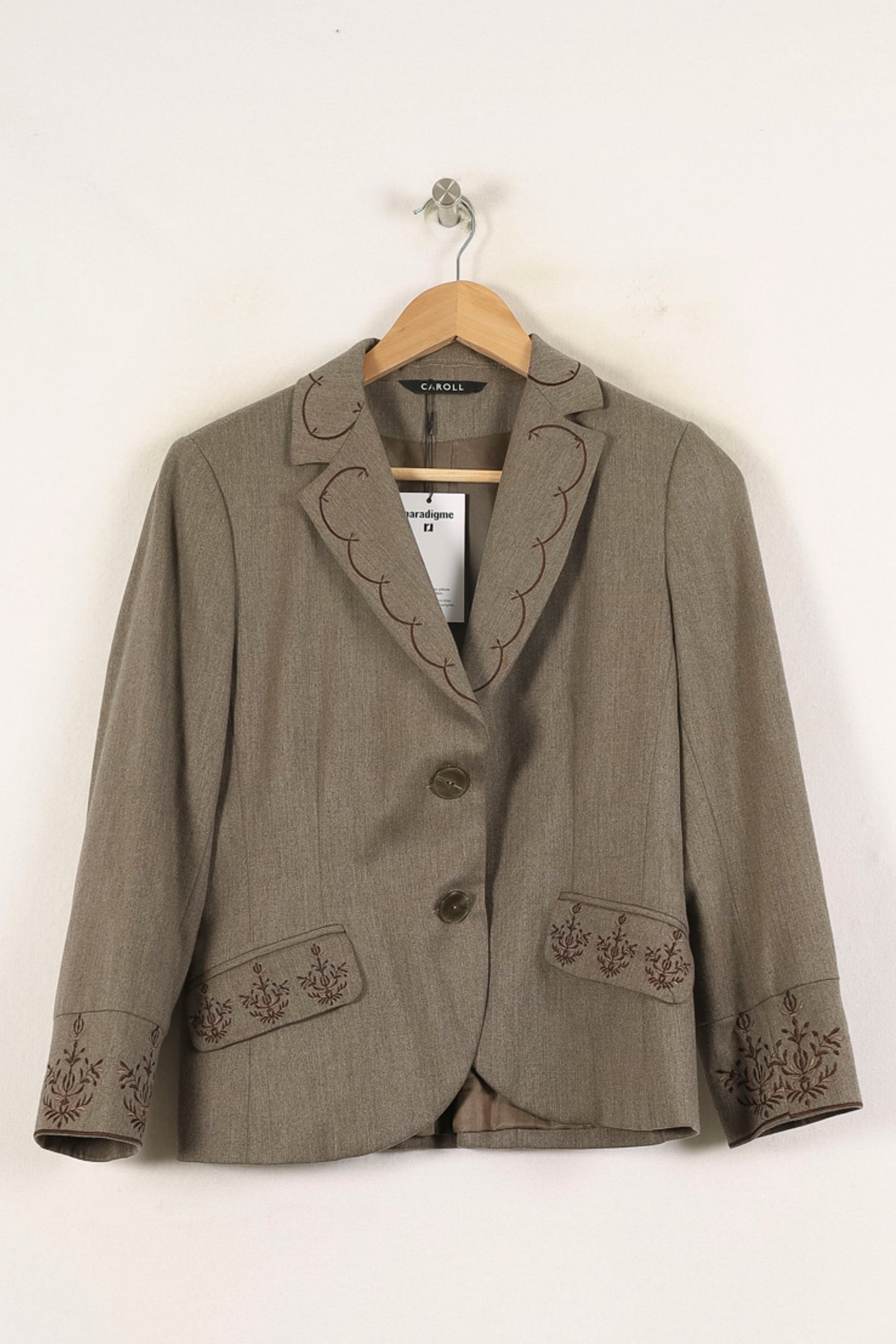 Veste marron Caroll taille L/40, ornée de broderies contrastées sur le col, les poignets et les poches, idéale pour une allure élégante et sophistiquée. Confectionnée dans une matière à l’aspect légèrement texturé, cette veste se distingue par ses motifs brodés raffinés qui apportent une touche d’originalité et de caractère. Parfaite pour une réunion professionnelle ou une sortie citadine, elle sublime toutes vos tenues de saison.
