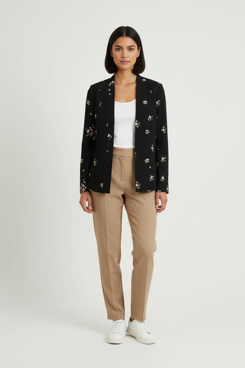 Veste noire I.Code, taille XS/34, ornée de délicats motifs floraux, idéale pour celles qui recherchent une pièce élégante et féminine. La matière fluide et douce, agrémentée de petites fleurs imprimées, apporte une touche de fraîcheur et de raffinement, rendant ce vêtement unique par son allure intemporelle. Parfaite pour un rendez-vous professionnel ou une sortie en soirée, cette veste complète une tenue chic en toute simplicité.