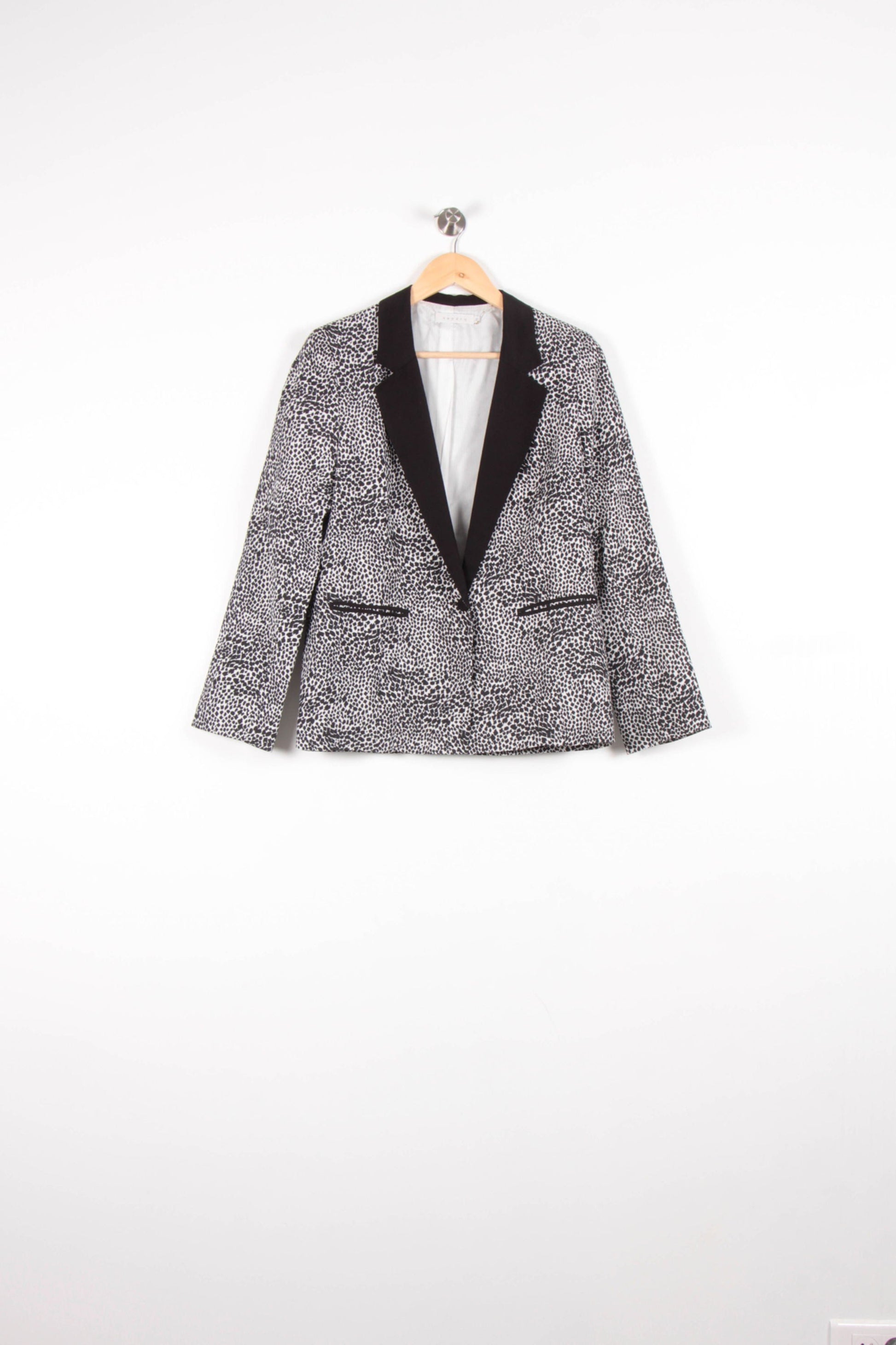 Veste imprimée Sandro noire taille L/40, dotée d’un élégant col à revers noirs et d’une coupe classique. Confectionnée dans une matière structurée avec un motif graphique noir et blanc distinctif, elle se distingue par ses détails raffinés et ses poches passepoilées qui lui confèrent un caractère unique. Parfaite pour une soirée chic ou un événement professionnel où l’élégance s’impose.