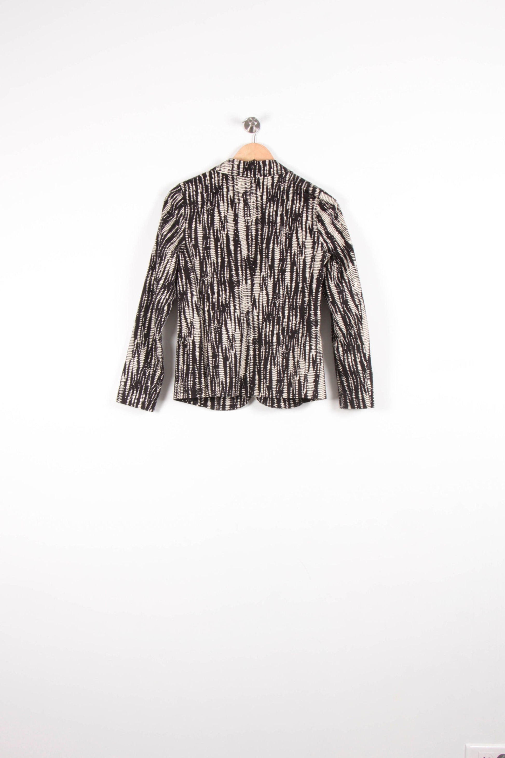 Veste multicolore La Fée Maraboutée, taille S/36, arborant un motif graphique noir et beige distinctif. La matière semble offrir un tombé structuré tandis que le motif all-over confère à cette pièce une allure singulière et contemporaine, rehaussée par un col tailleur classique et une fermeture boutonnée. Idéale pour sublimer une tenue de bureau ou pour apporter une touche d’élégance moderne à un dîner entre amis.