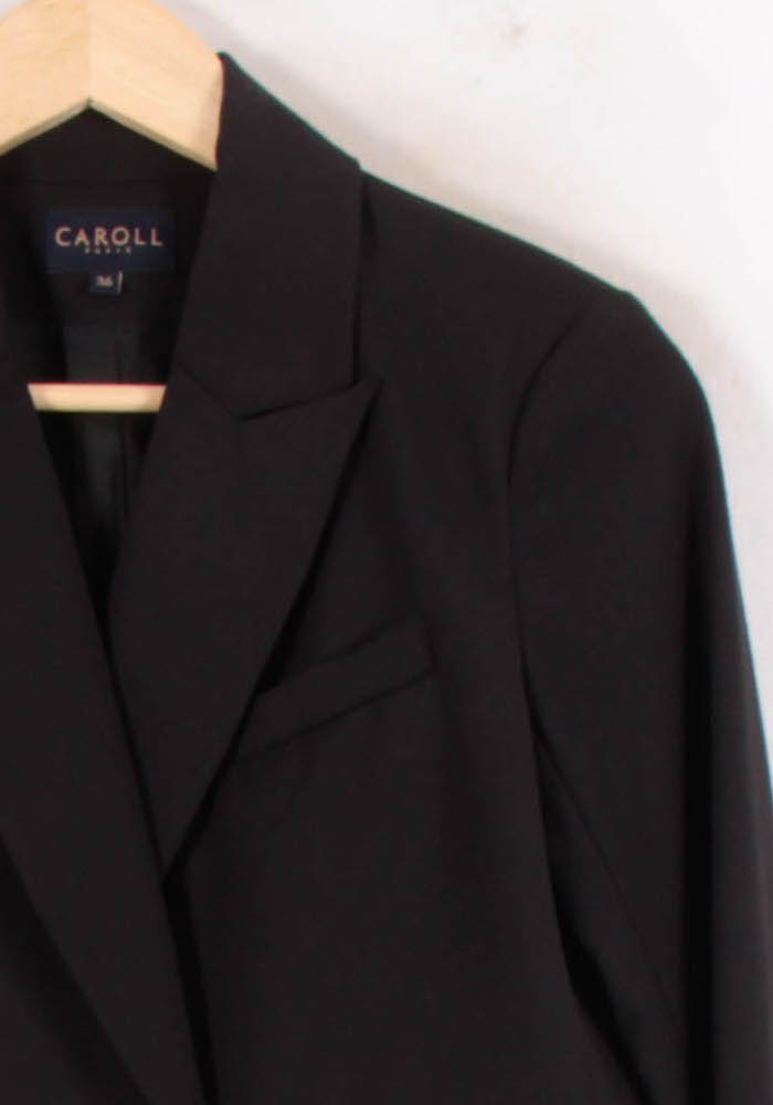 Veste noire courte Caroll, taille S/36, à la coupe élégante et structurée. Confectionnée dans une matière fluide présentant une finition lisse, elle se distingue par un double boutonnage et des détails minimalistes pour une allure moderne et sophistiquée. Idéale pour un rendez-vous professionnel ou une soirée chic, elle sublimera une tenue urbaine avec raffinement.