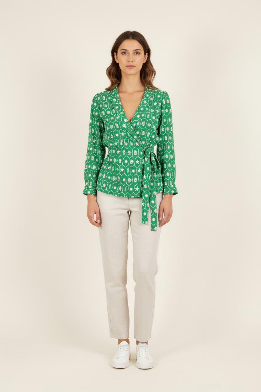 Veste verte Barje, taille S/36, caractérisée par une coupe cintrée et un imprimé graphique original. Sa matière légère au tombé fluide, associée à un motif géométrique blanc unique sur fond vert, apporte une touche contemporaine tout en assurant un confort optimal. Idéale pour sublimer une tenue lors d’un événement printanier ou d’un dîner élégant.