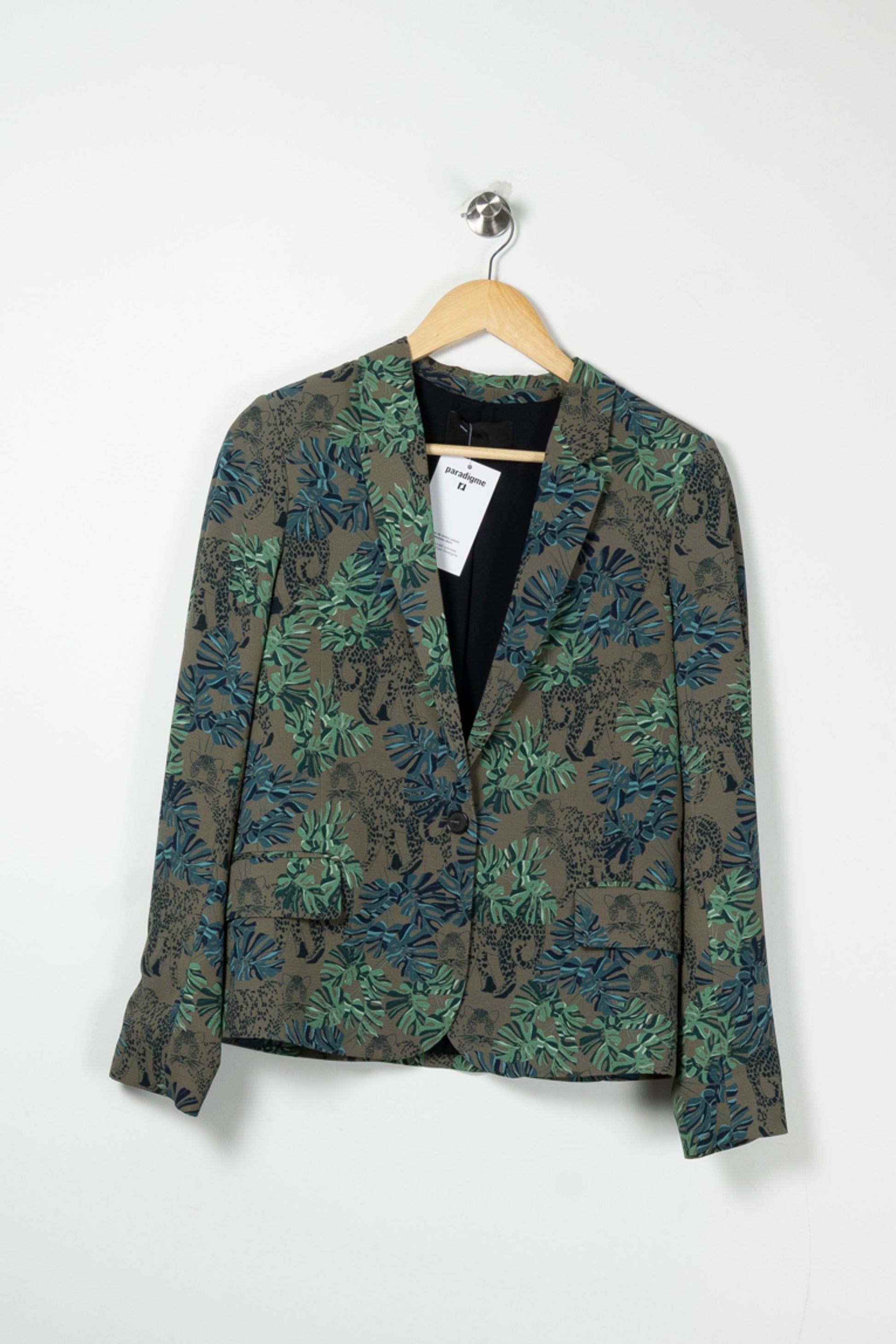 Veste imprimée à motifs verts IKKS, taille S/36, parfaite pour apporter une touche d’originalité à vos tenues. Confectionnée en 100% polyester avec une doublure 100% cupro, cette veste se distingue par son tissu léger et fluide rehaussé d’un imprimé jungle élégant et moderne. Idéale pour dynamiser une tenue de bureau ou sublimer un look lors d’un dîner en ville.