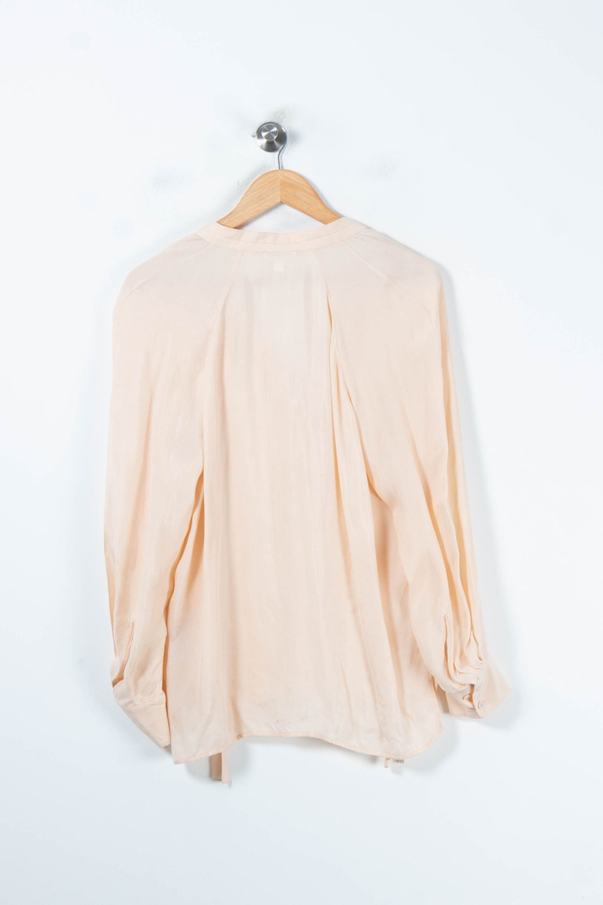 Blouse fluide beige ample COS, taille M/38, à manches longues et détail liens à nouer à l’encolure. Confectionnée en 100% cupro, cette pièce se distingue par sa texture légère et soyeuse, ses poignets boutonnés et sa coupe décontractée qui lui apportent une élégance épurée et contemporaine. Idéale pour une journée professionnelle ou un dîner en ville, portée avec un pantalon tailleur ou une jupe midi.