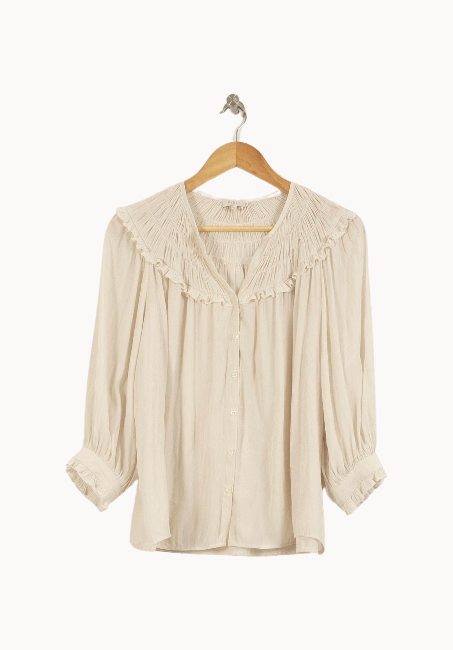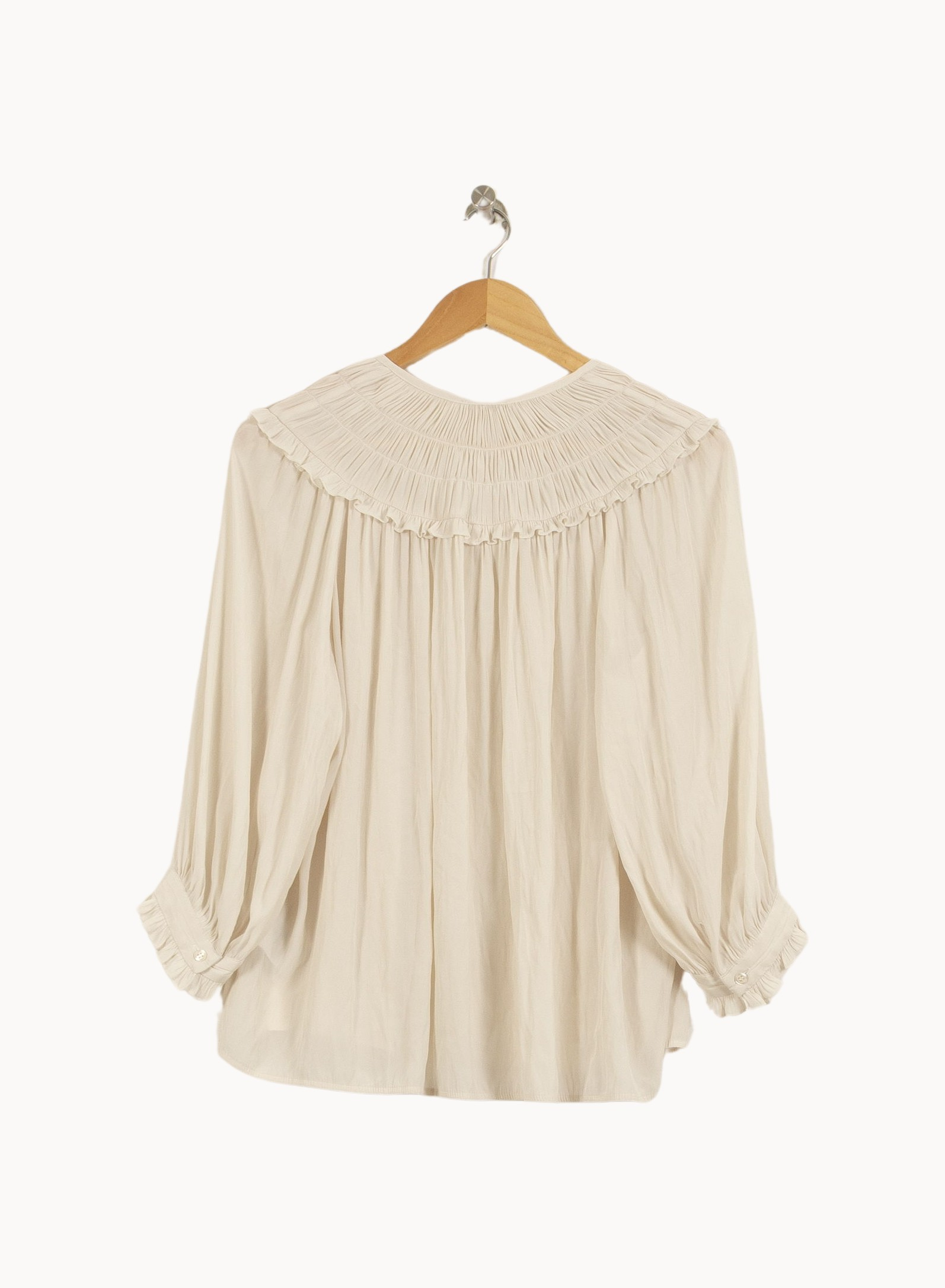 Blouse à col volanté beige Pablo, taille S/36, alliant élégance et féminité. Confectionnée dans une matière fluide et légère, cette blouse se distingue par un travail plissé raffiné au niveau du col agrémenté de volants délicats, ainsi que par la souplesse de ses manches longues terminées par un poignet subtilement froncé. Parfaite pour une réunion professionnelle ou un déjeuner chic, elle apporte une touche sophistiquée à toutes vos tenues.