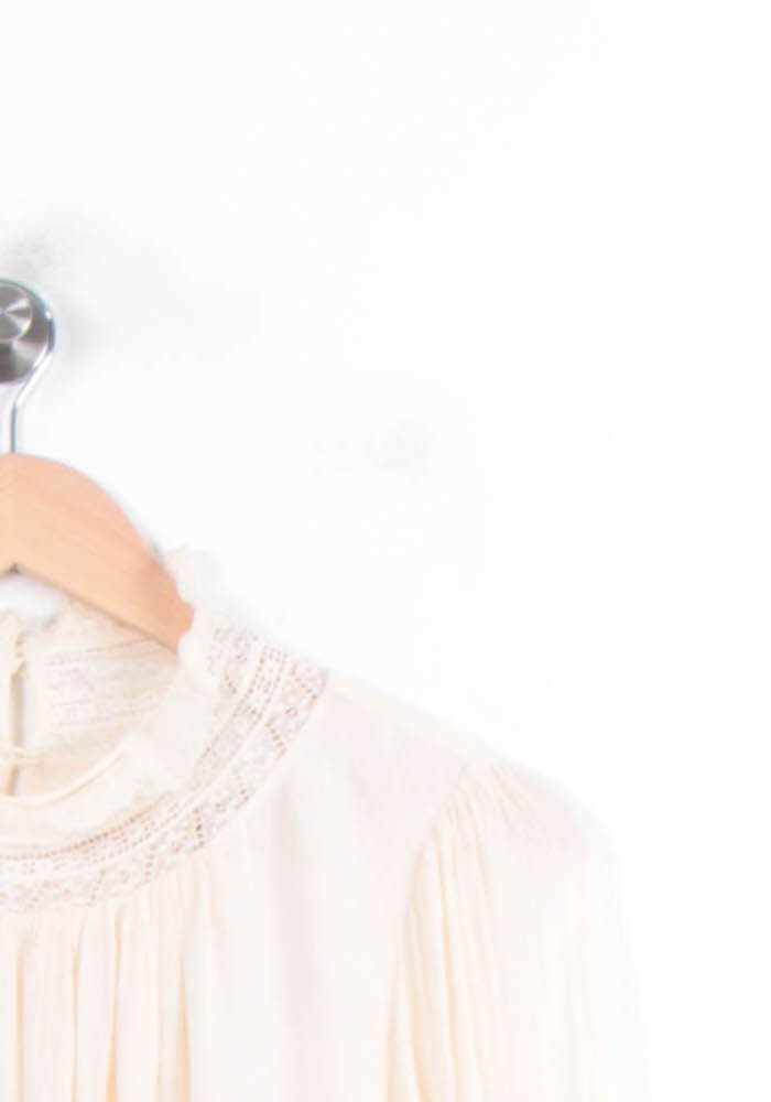 Blouse beige à manches longues de la marque ba&sh, taille S/36, au style raffiné et féminin. Confectionnée dans une matière fluide, elle est agrémentée d’un col montant délicatement orné de dentelle et de fronces fines, apportant une touche d’élégance et de légèreté qui la distingue. Parfaite pour un déjeuner en ville ou une réunion professionnelle, elle apporte une note sophistiquée à toute tenue.