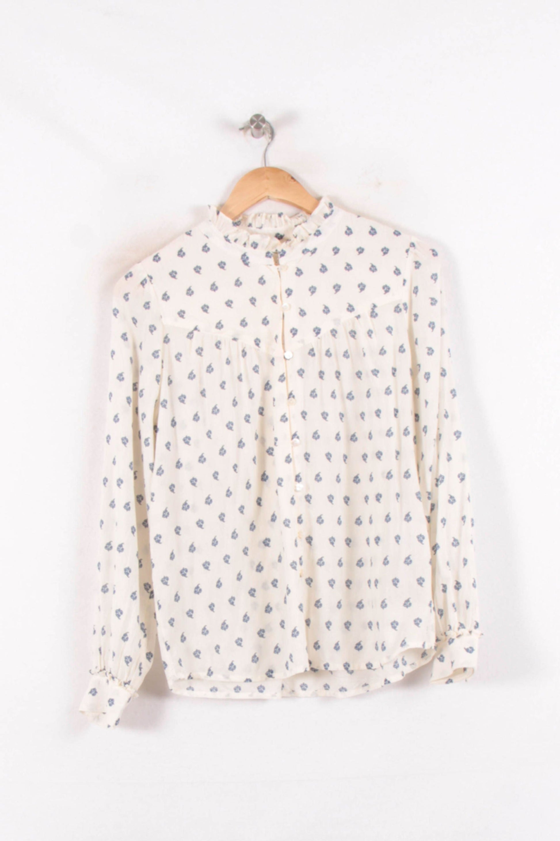 Blouse imprimée blanche à motif bleu Maison 123, taille S/36 : cette blouse élégante à manches longues offre une silhouette fluide et raffinée. Réalisée dans une matière légère, elle se distingue par son col légèrement volanté et sa patte de boutonnage discrète, ainsi que ses fronces délicates qui ajoutent une note féminine et singulière à l’ensemble. Parfaite pour une journée au bureau ou une sortie décontractée en terrasse.