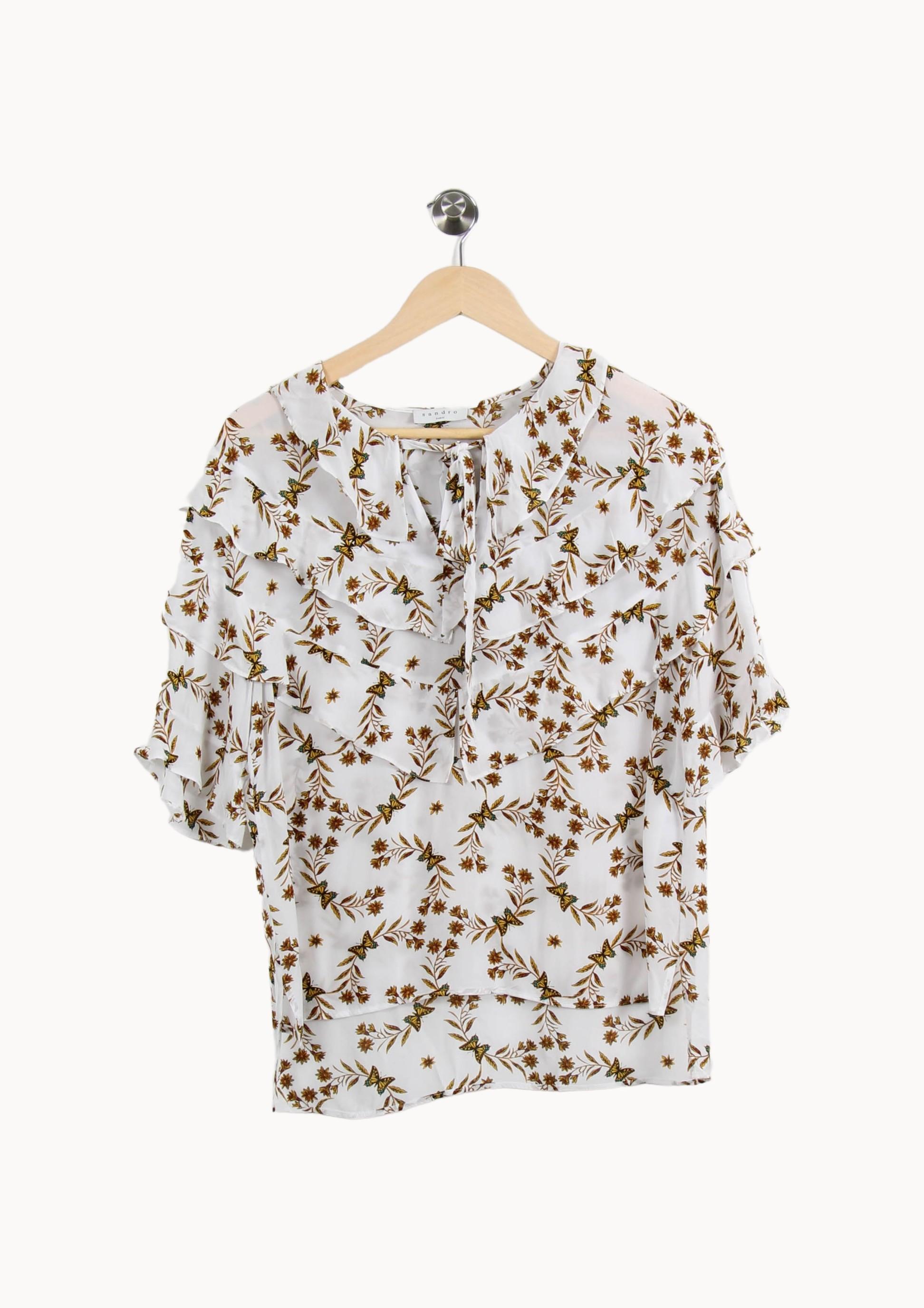 Blouse multicolore à imprimé floral et papillons Sandro, taille XS/34, élégante et raffinée, idéale pour rehausser votre garde-robe. Confectionnée dans une matière fluide, ce top se distingue par ses volants délicats, ses manches courtes et son lien à nouer au col, apportant une touche de féminité unique. Parfaite pour un déjeuner entre amis ou une sortie estivale, elle vous accompagnera avec style et légèreté.