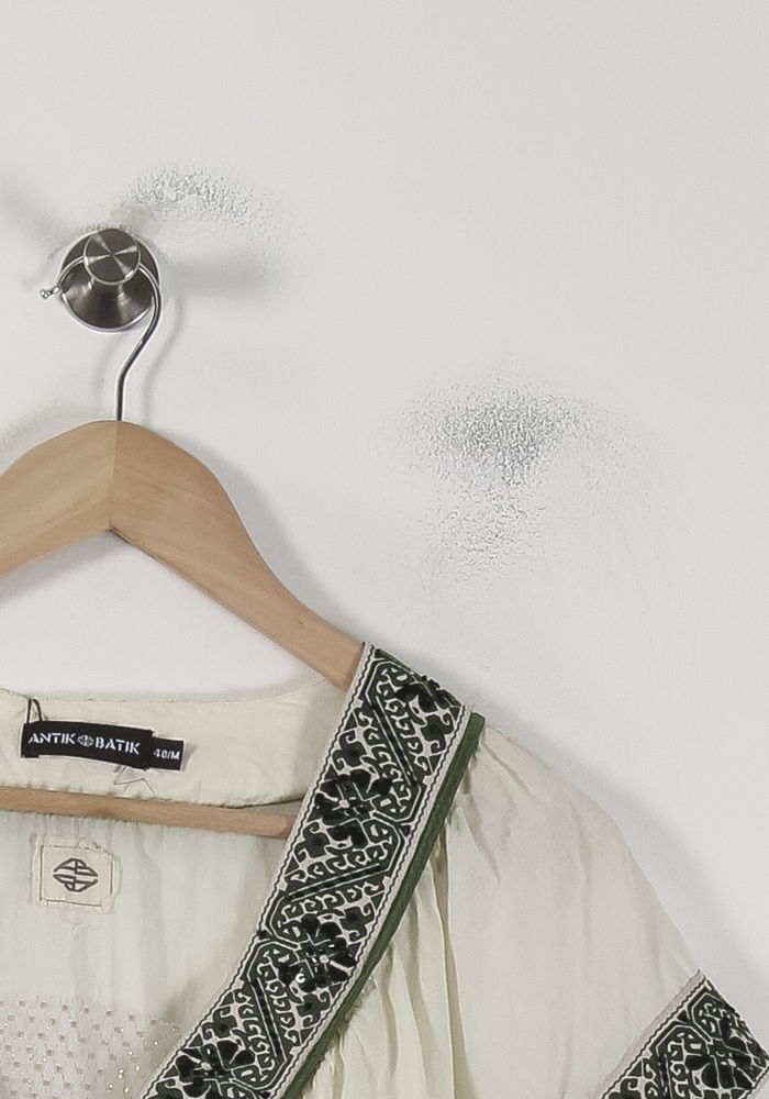 Top blanc en coton 100% signé Antik Batik, taille L/40, avec broderies noires et vertes en contraste sur les manches, l’encolure et le bas du vêtement. Confectionné en coton léger, ce haut se distingue par ses détails brodés raffinés, sa coupe ample et ses finitions soigneusement travaillées, offrant un style bohème authentique. Idéal pour une sortie estivale ou une ambiance décontractée et chic.