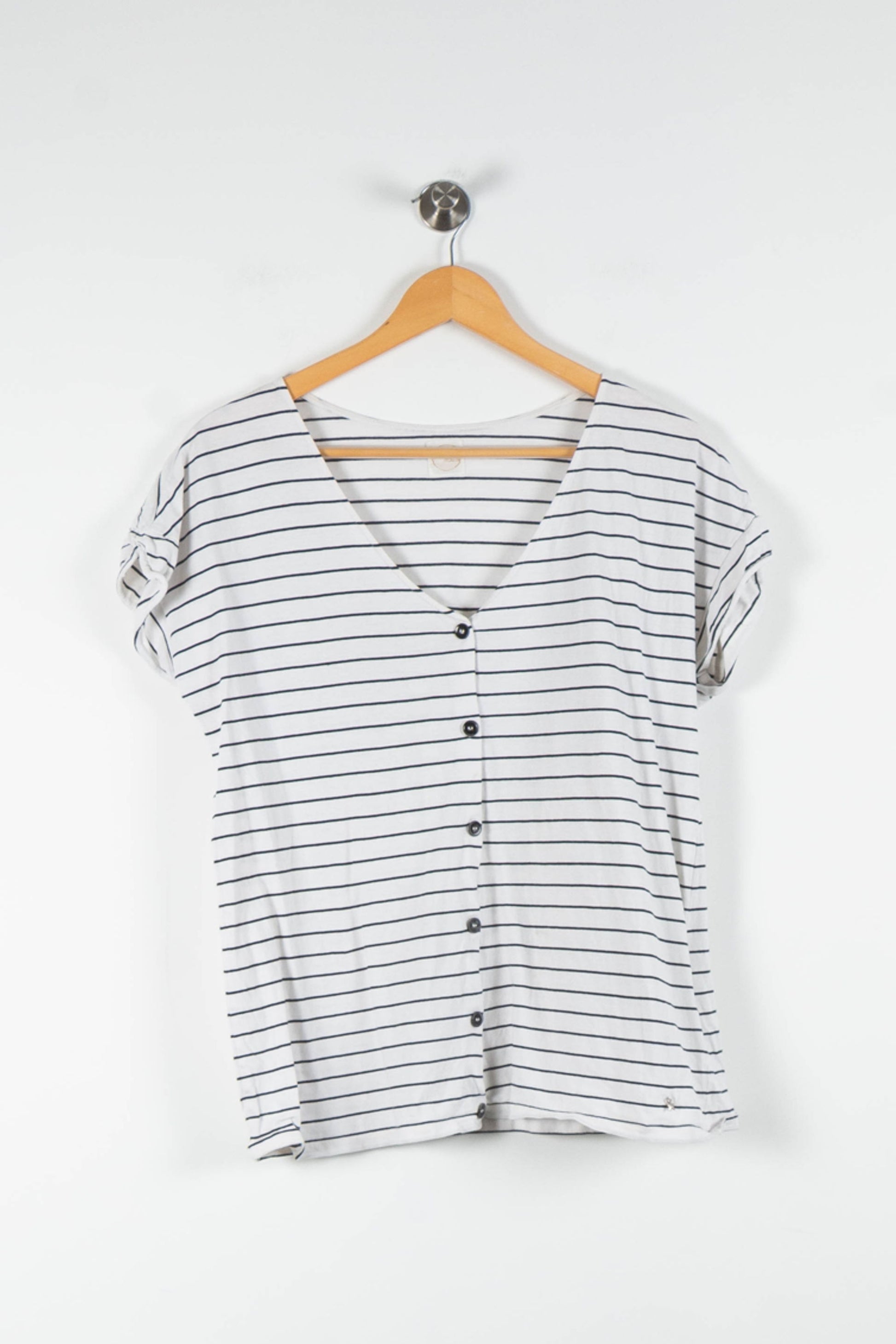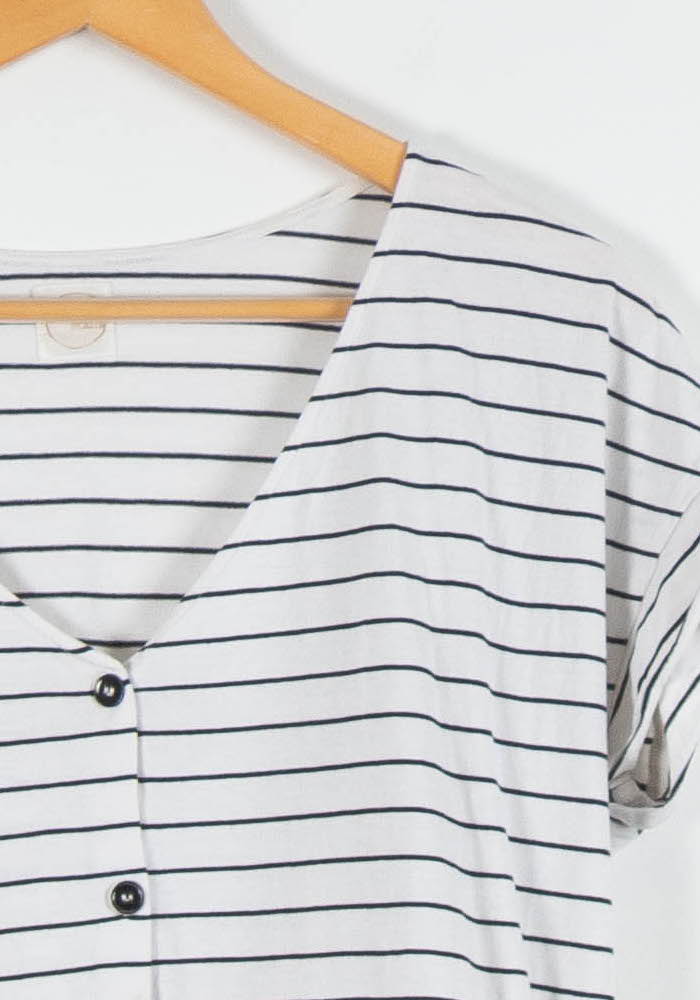 Top à rayures blanches et noires Des Petits Hauts, coupe droite, en taille M/38. Confectionné dans une matière fluide et légère, ce modèle se distingue par son encolure en V, sa boutonnière sur toute la longueur et ses manches courtes retroussées, détails qui apportent une touche de raffinement décontracté. Idéal pour une journée de travail associée à un pantalon habillé, ou pour un brunch en ville avec un jean et des sneakers.