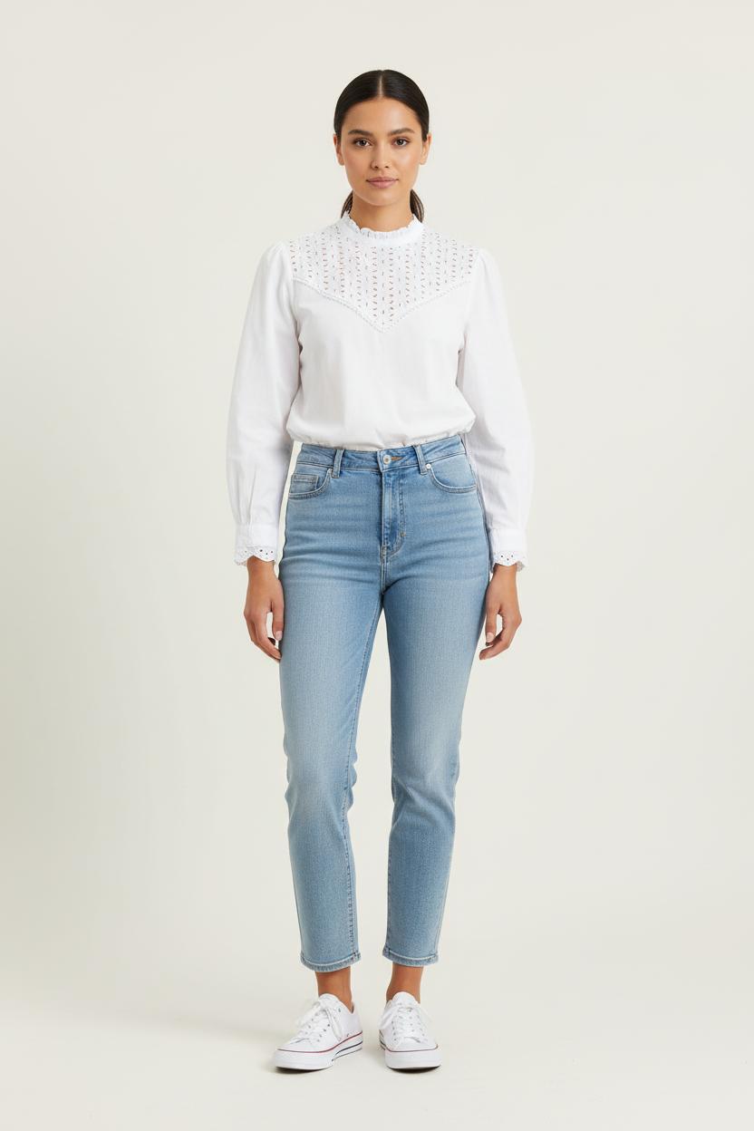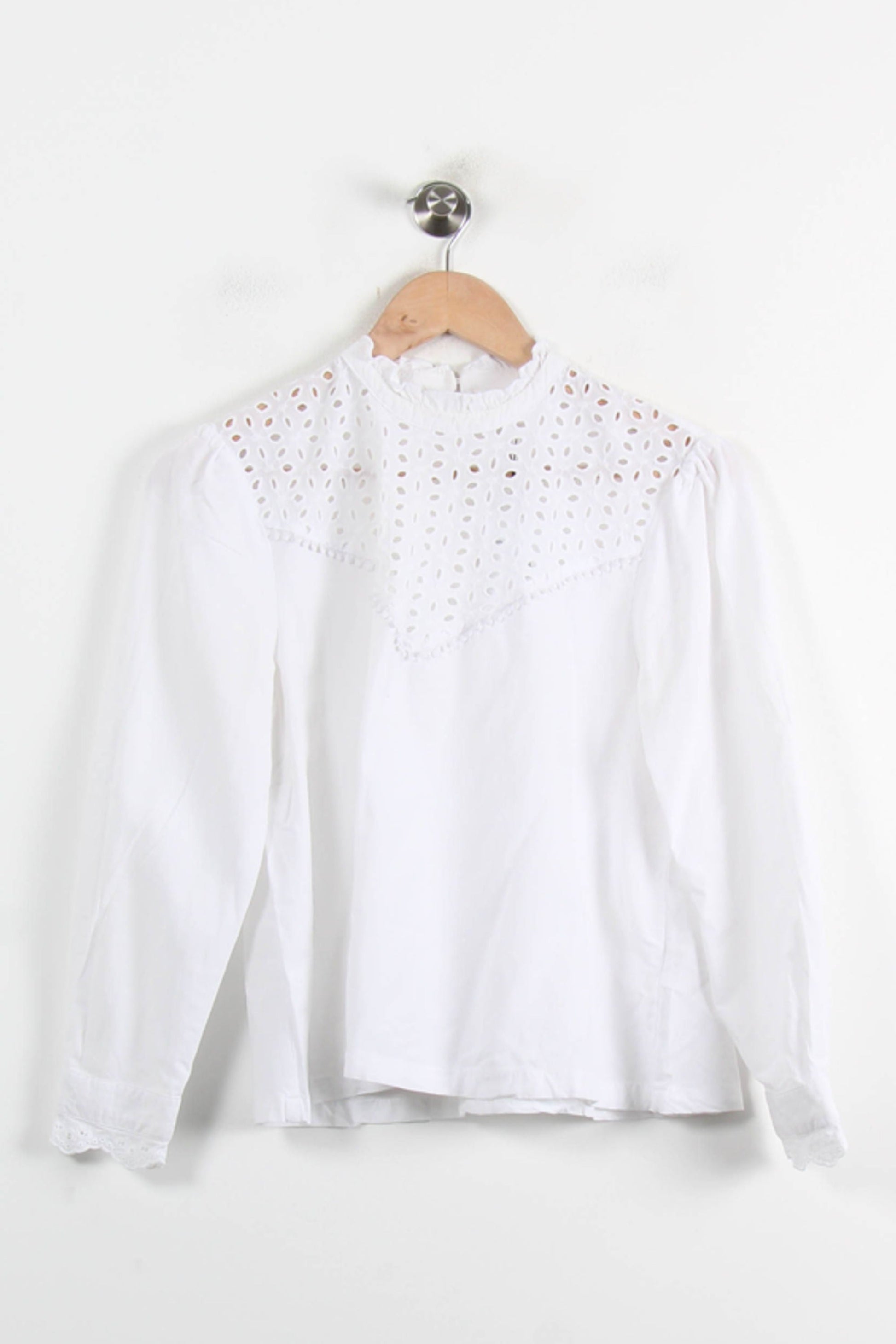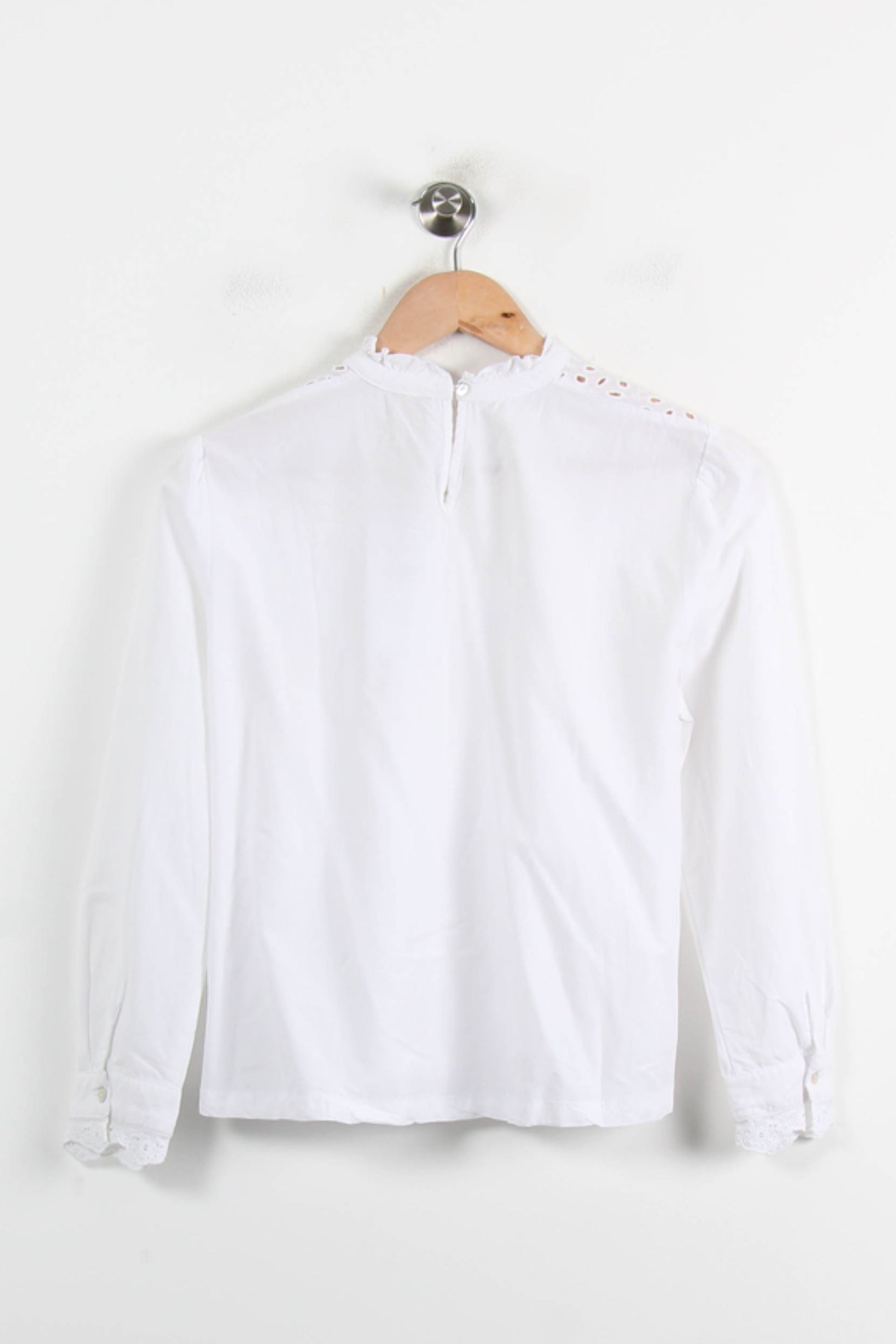 Blouse blanche à manches longues Karl Marc John, taille L/40, élégante et raffinée, idéale pour sublimer votre collection de tops. Ce modèle se distingue par son empiècement ajouré au niveau du haut de la poitrine et des épaules, ajoutant une touche délicate et féminine, tandis que les poignets sont ornés d’un subtil détail brodé, conférant au vêtement une allure unique et sophistiquée. Parfaite pour une réunion professionnelle ou un déjeuner chic, cette blouse apportera une note de fraîcheur et de raffinement à votre tenue.