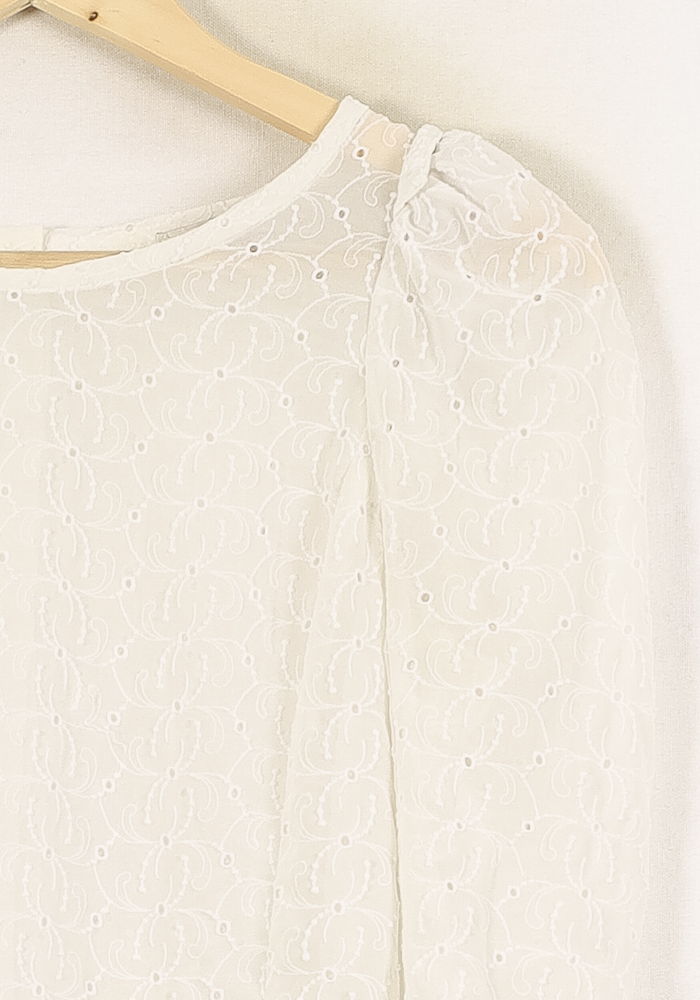 Top blanc Maje taille L/40, élégant et raffiné, parfait pour sublimer une tenue de saison. Son tissu léger et délicat, agrémenté de manches légèrement bouffantes et de subtils détails ajourés sur les épaules, confère à ce vêtement une allure unique et sophistiquée. Ce top se prête idéalement à une journée au bureau associée à un pantalon habillé ou pour un brunch chic entre amis.
