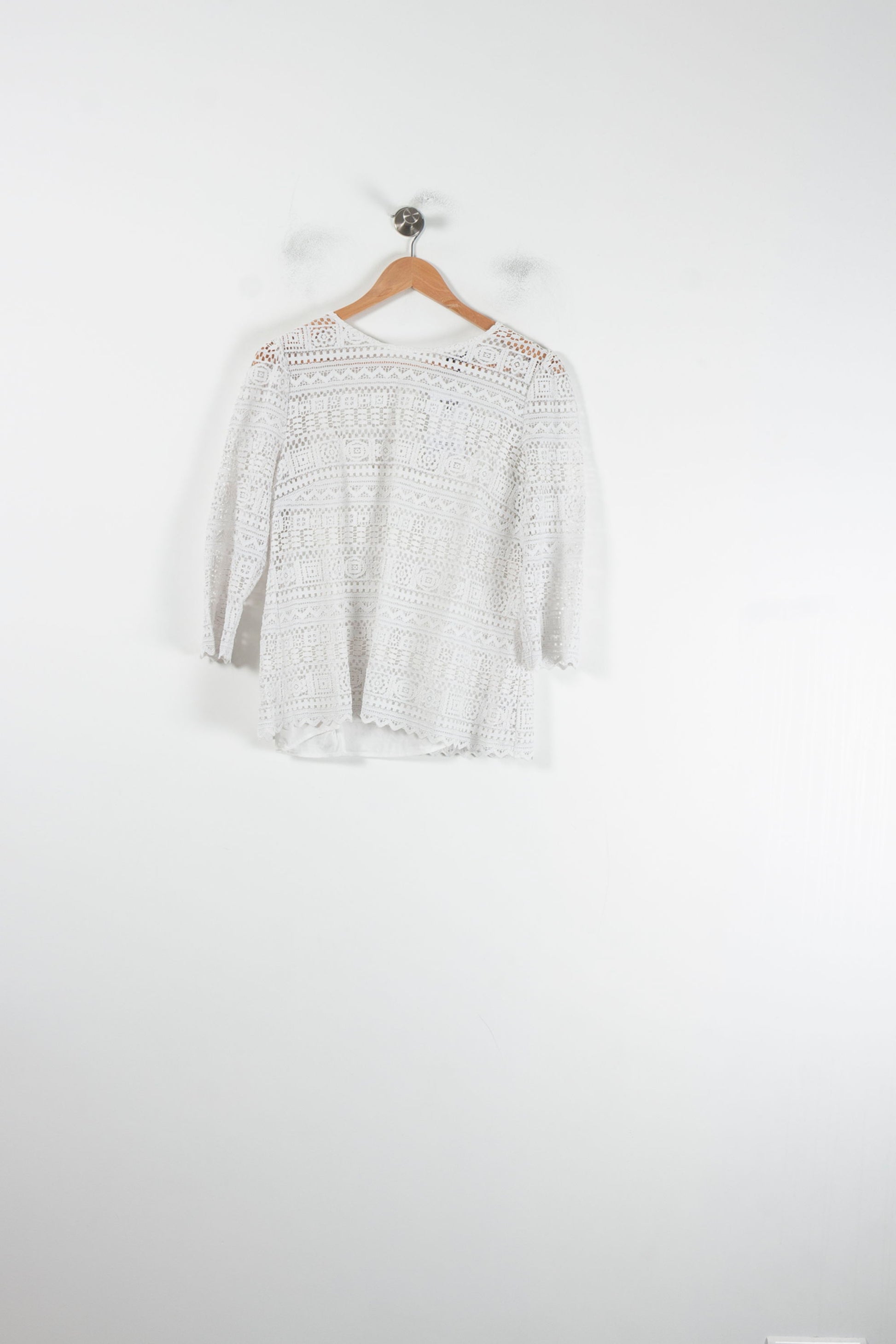 Top en dentelle blanc Caroll, taille L/40, élégant et raffiné, parfait pour sublimer votre garde-robe. Confectionné en 100% viscose avec une doublure assortie, ce modèle présente une finition en dentelle ajourée aux motifs géométriques, qui lui confère une allure unique et délicate. Idéal pour une sortie estivale ou un déjeuner chic entre amis.