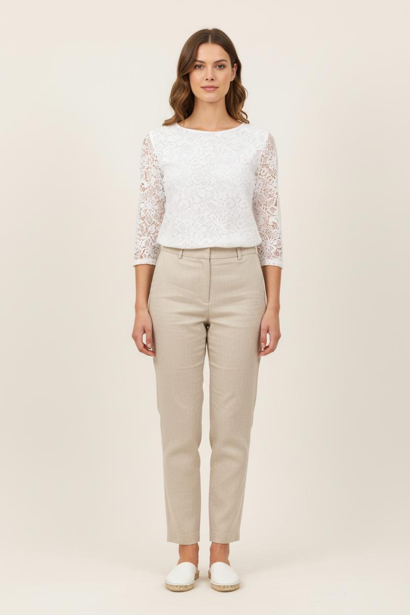 Top blanc en dentelle Maison 123, taille M/38, élégant et raffiné. Ce modèle se distingue par sa matière en dentelle finement ajourée, qui lui confère une touche délicate et féminine, typique du savoir-faire de la marque. Idéal pour un déjeuner estival ou une occasion habillée, il se mariera parfaitement avec un pantalon chic ou une jupe.