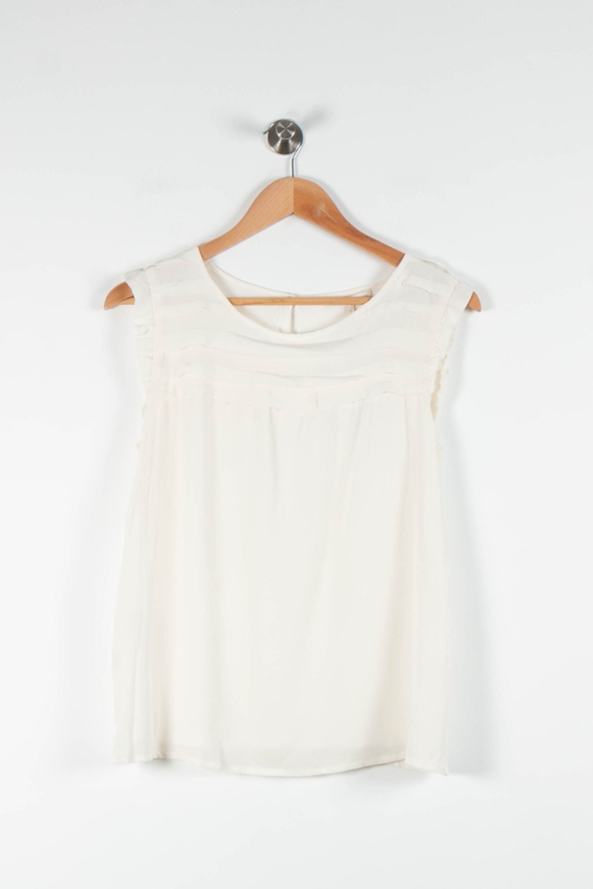 Top sans manches blanc Maje, taille M/38, élégant et raffiné, idéal pour compléter votre garde-robe estivale. Confectionné dans une matière fluide et délicate, ce modèle se distingue par ses détails de bandes transparentes sur les épaules et le haut du buste, apportant une touche de modernité et de légèreté à l’ensemble. Parfait pour un déjeuner chic en terrasse ou une journée au bureau sous le signe de l’élégance décontractée.