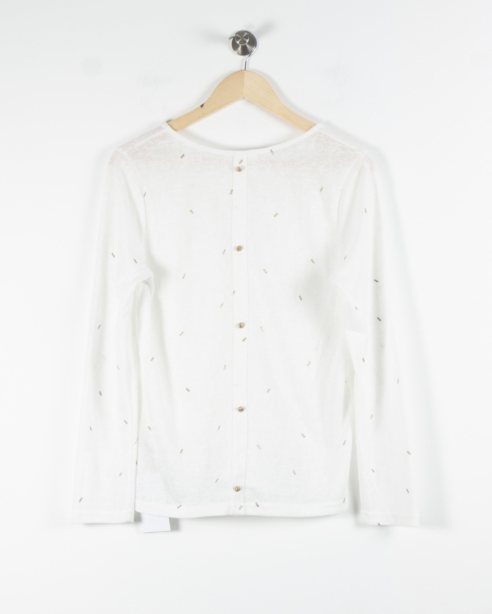 Pull blanc Grace & Mila taille M/38, col en V, orné de petits motifs dorés et de délicats détails ajourés sur les épaules. Confectionné en 100% polyester, ce pull séduit par sa légèreté et sa finition en dentelle, apportant une touche raffinée et féminine à la silhouette. Idéal pour une sortie entre amis ou une journée élégante au bureau.