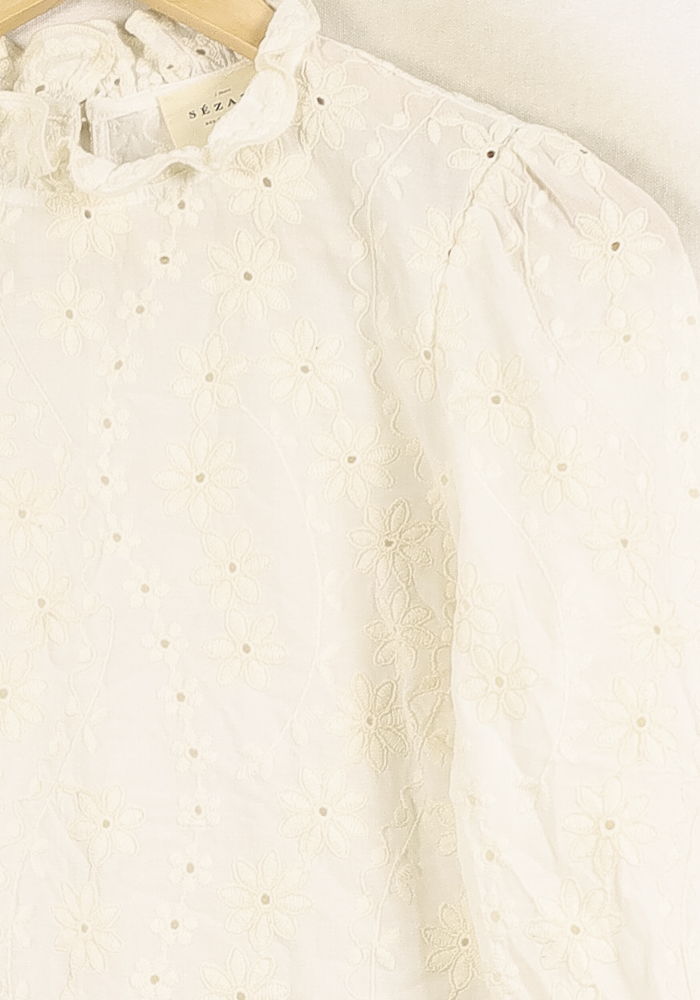 Blouse blanche en broderie anglaise Sézane, taille S/36, élégante et intemporelle, idéale pour sublimer votre garde-robe. Son tissu délicatement ajouré et ses motifs floraux brodés apportent une touche romantique et raffinée, agrémentée d’un col légèrement volanté pour souligner son originalité. Parfait pour un déjeuner en terrasse ou une journée au bureau, elle se porte aisément avec un jean ou une jupe.