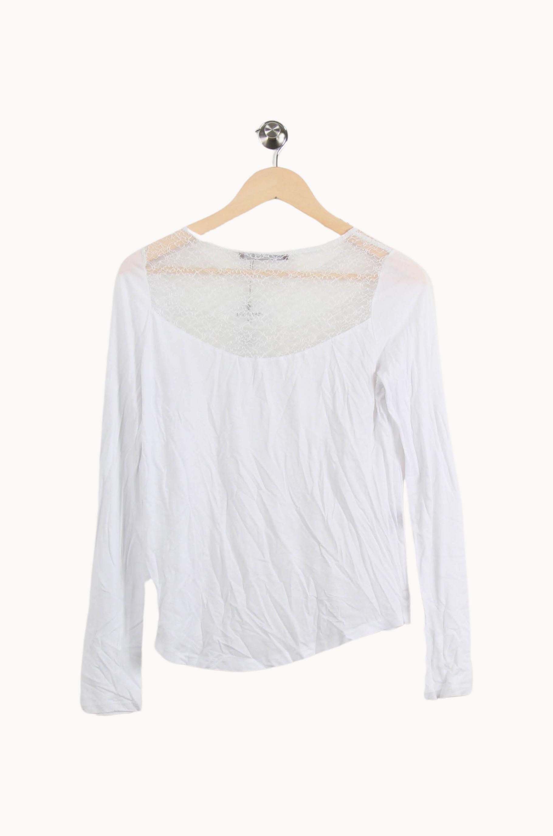 Top blanc à manches longues Comptoir des Cotonniers, taille S/36, élégant et léger, idéal pour un style raffiné au quotidien. La matière fluide est rehaussée d’un empiècement en dentelle délicate sur le haut, soulignant la féminité et apportant une touche de sophistication unique à ce modèle. Parfait pour une journée au bureau ou un déjeuner entre amies, ce top habille vos tenues avec subtilité et charme.