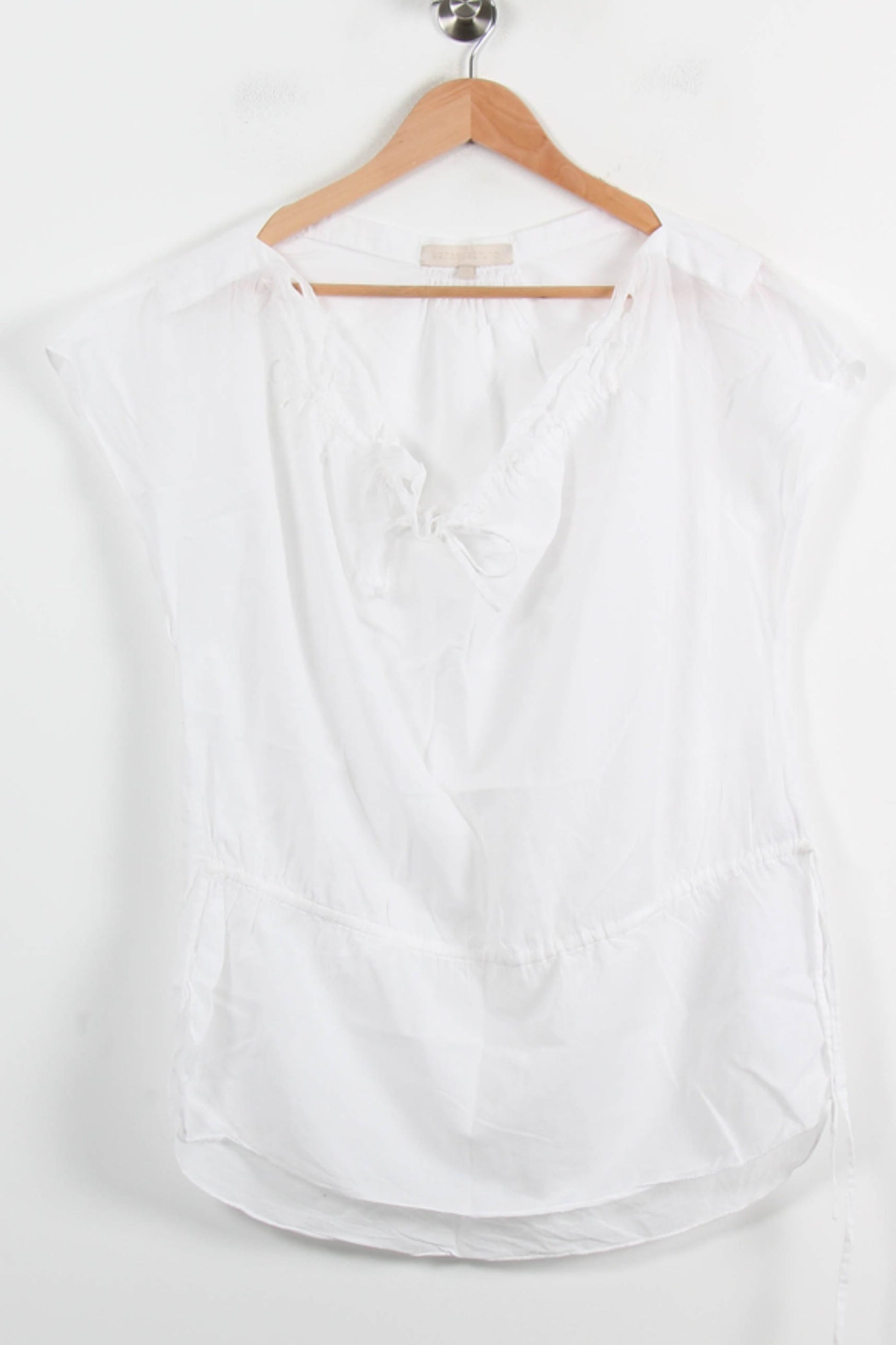 Top blanc en coton Vanessa Bruno, taille S/36, à manches courtes et encolure en V délicatement décorée d’un lien à nouer. La matière légère en coton offre un tombé fluide et aérien, tandis que les fronces et le petit nœud sur le décolleté ajoutent une touche féminine subtile et raffinée à cette pièce intemporelle. Parfait pour une journée estivale en ville ou un déjeuner en terrasse, ce top se porte facilement avec un pantalon chic ou une jupe légère.