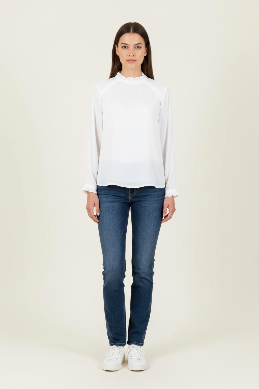 Top blanc à manches longues Suncoo, taille S/36 – un basique élégant parfait pour toutes les saisons. Confectionné dans une matière fluide et délicate, ce top présente des poignets boutonnés ornés de fines fronces ainsi qu’un col légèrement volanté, détails qui lui confèrent une touche raffinée et féminine. Idéal à porter lors d’un déjeuner professionnel ou pour sublimer une tenue de bureau.
