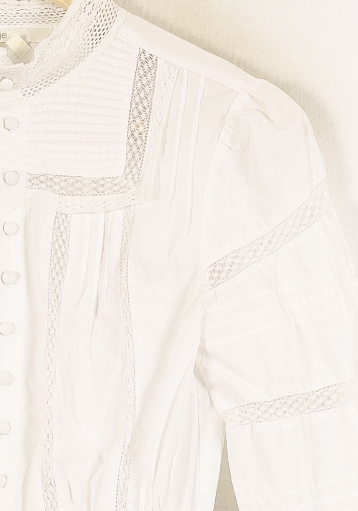Top en dentelle blanche Maje, taille S/36 – un modèle raffiné à manches longues, orné de détails ajourés et boutonnage à l’avant. Confectionné dans une matière légère, ce top se distingue par ses empiècements en dentelle délicate, ses fronces ainsi que ses lignes élégantes, offrant une allure féminine et sophistiquée. Idéal pour une occasion élégante telle qu’un déjeuner raffiné ou une réception printanière.