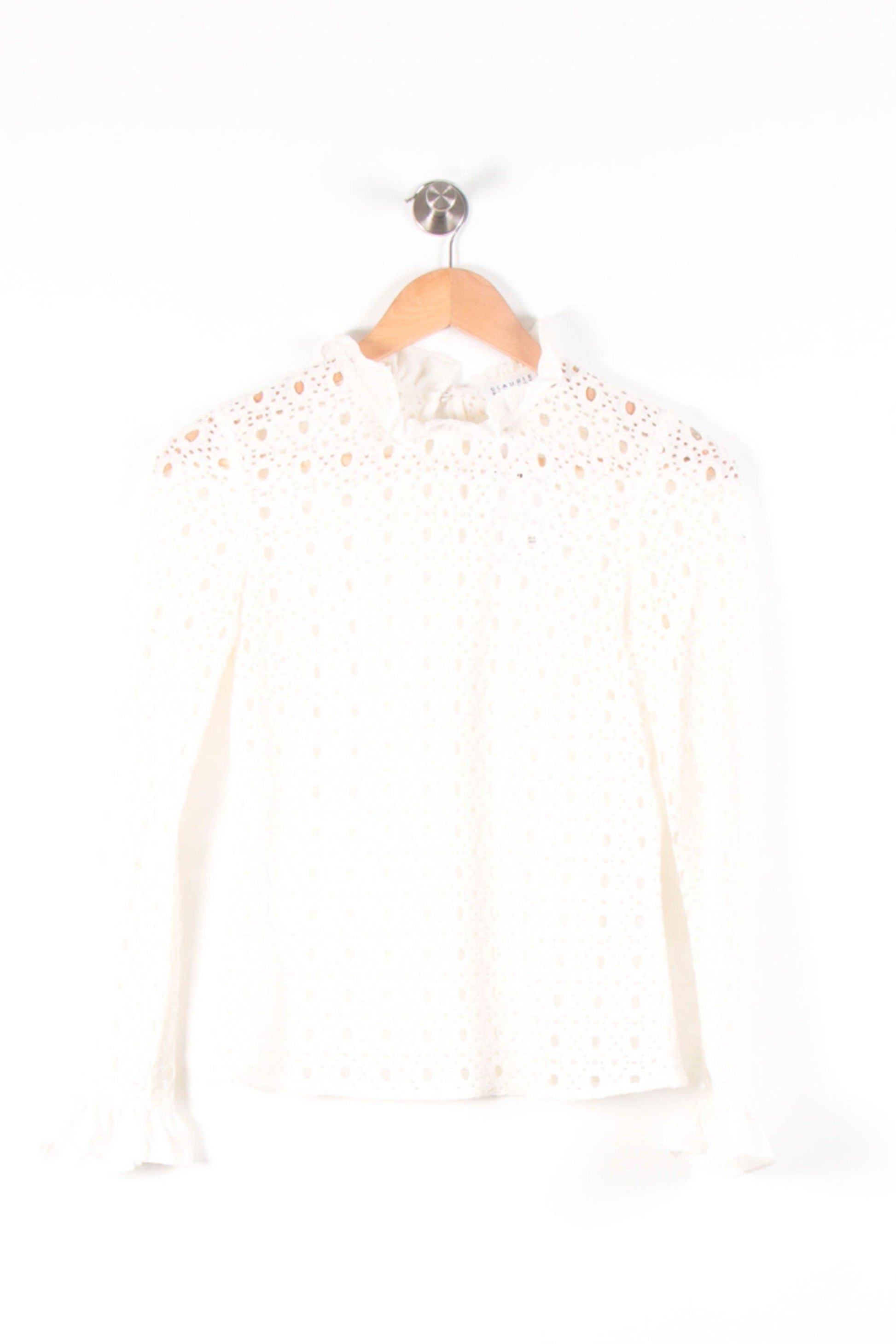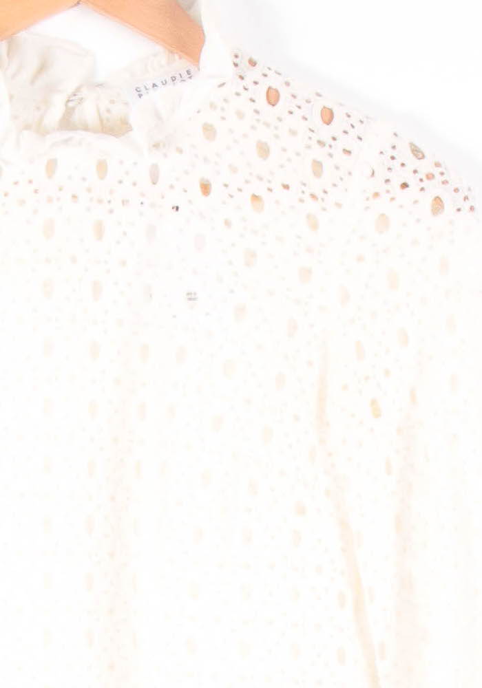 Top blanc Claudie Pierlot en taille S/36, alliant élégance et raffinement avec son design délicat. Confectionné dans une matière ajourée façon broderie anglaise, ce modèle se distingue par des finitions volantées au col et aux poignets, apportant une touche féminine et sophistiquée. Idéal pour une garden-party ou une cérémonie estivale, il sublime une silhouette avec légèreté.