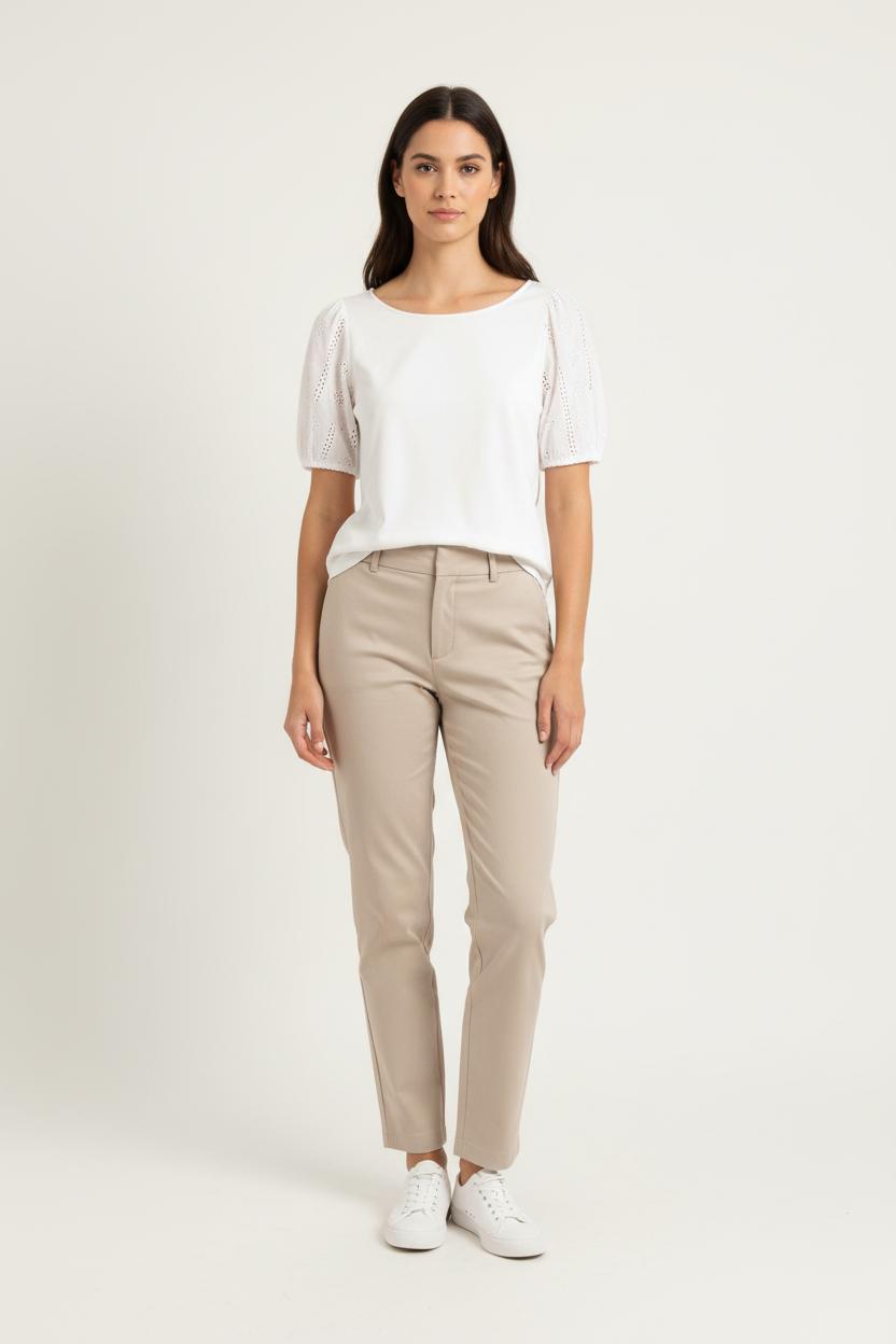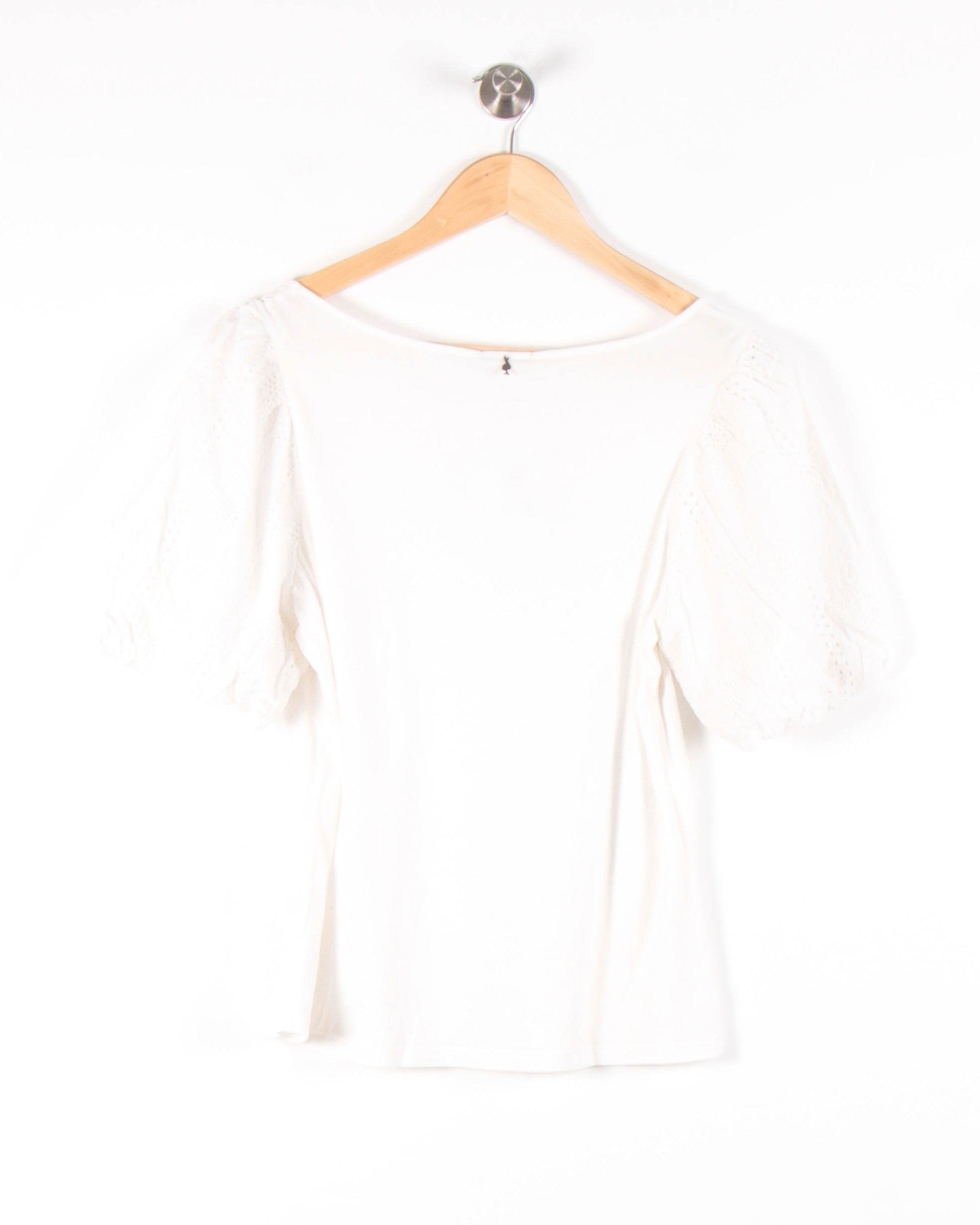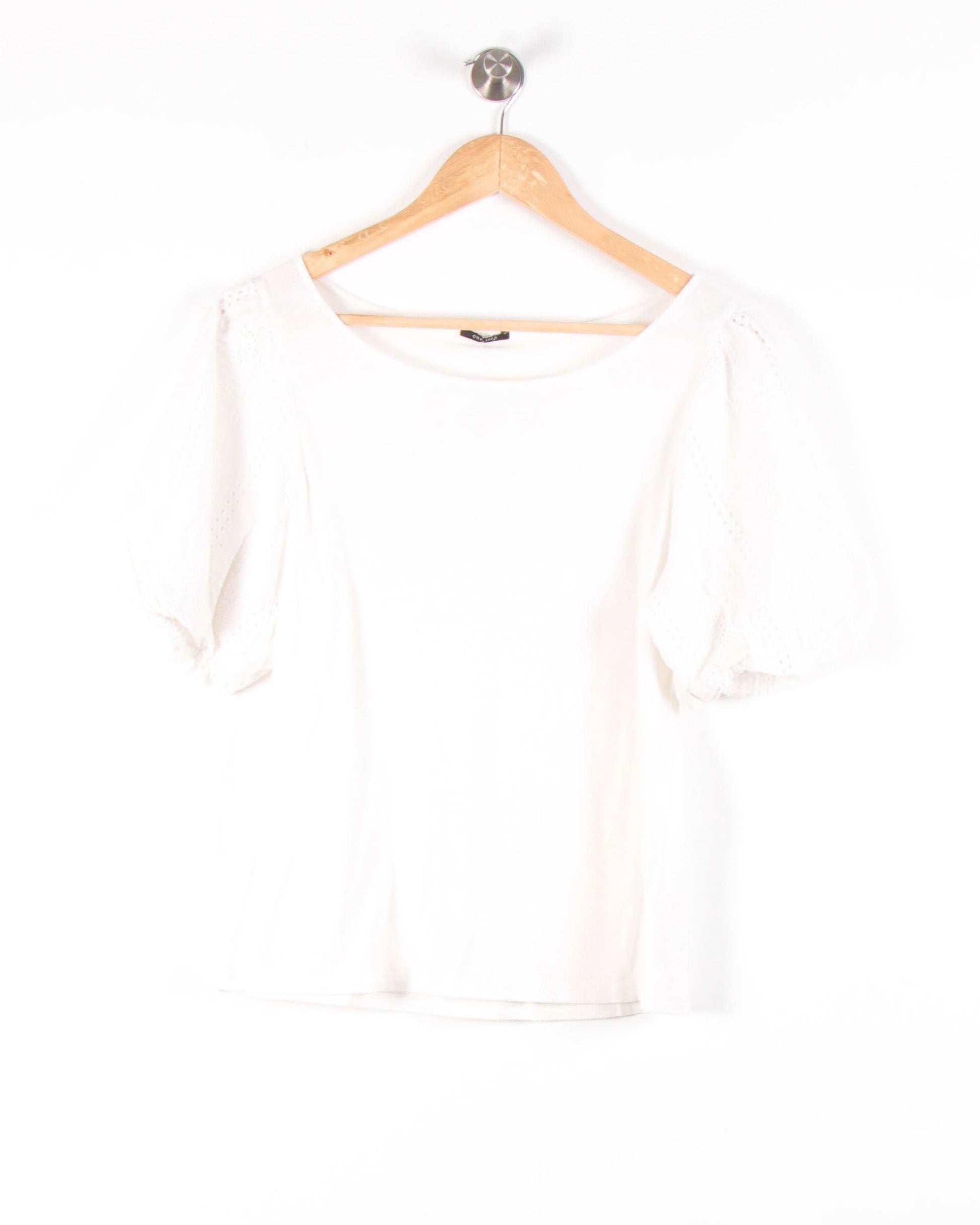 Top blanc One Step, taille S/36, doté de manches courtes bouffantes et ajourées qui apportent élégance et modernité à la silhouette. Ce haut se distingue par ses manches en broderie anglaise et son tissu principal lisse et léger, idéal pour une allure raffinée et féminine. Parfait pour une journée au bureau ou une sortie détente en ville.