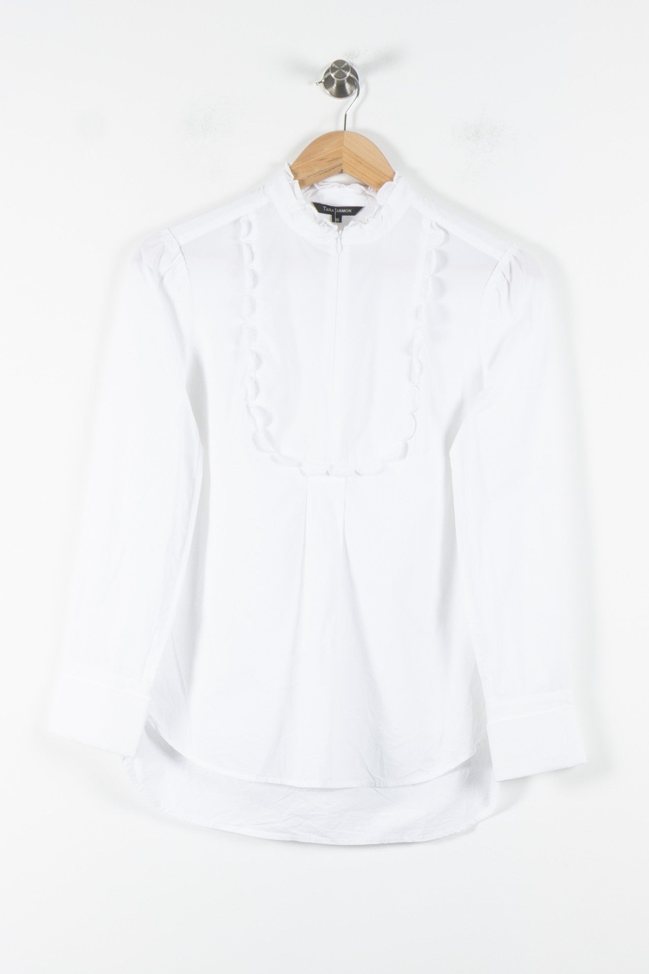 Chemise blanche Tara Jarmon à manches longues pour femme, taille S/36, au design élégant et épuré. Confectionnée en 100% coton, elle se distingue par ses bordures délicatement festonnées sur le devant et son encolure montante, apportant une touche raffinée et féminine à la pièce. Idéale pour une journée au bureau ou un rendez-vous professionnel, elle s’associe parfaitement à un pantalon habillé ou une jupe tailleur.