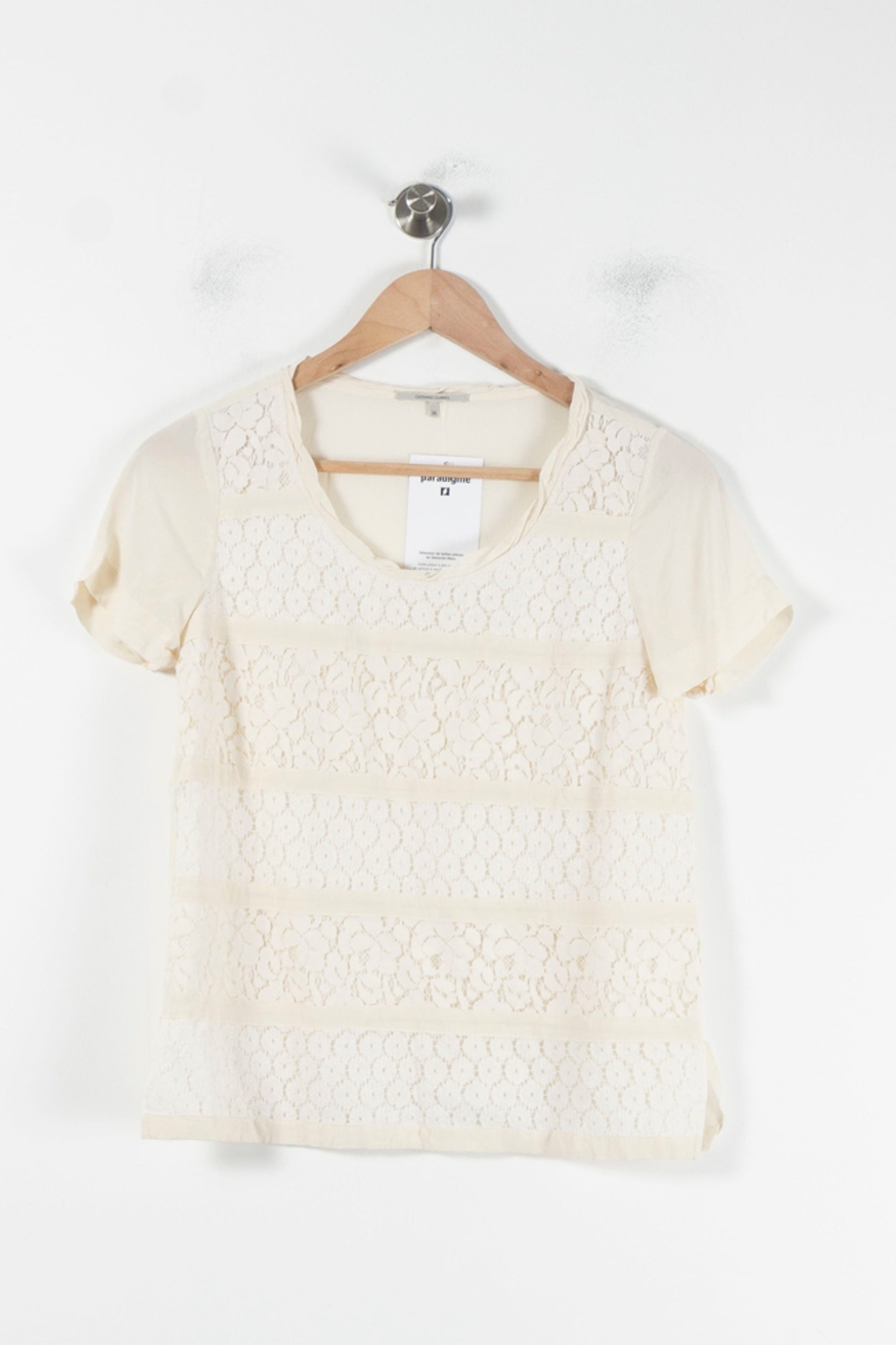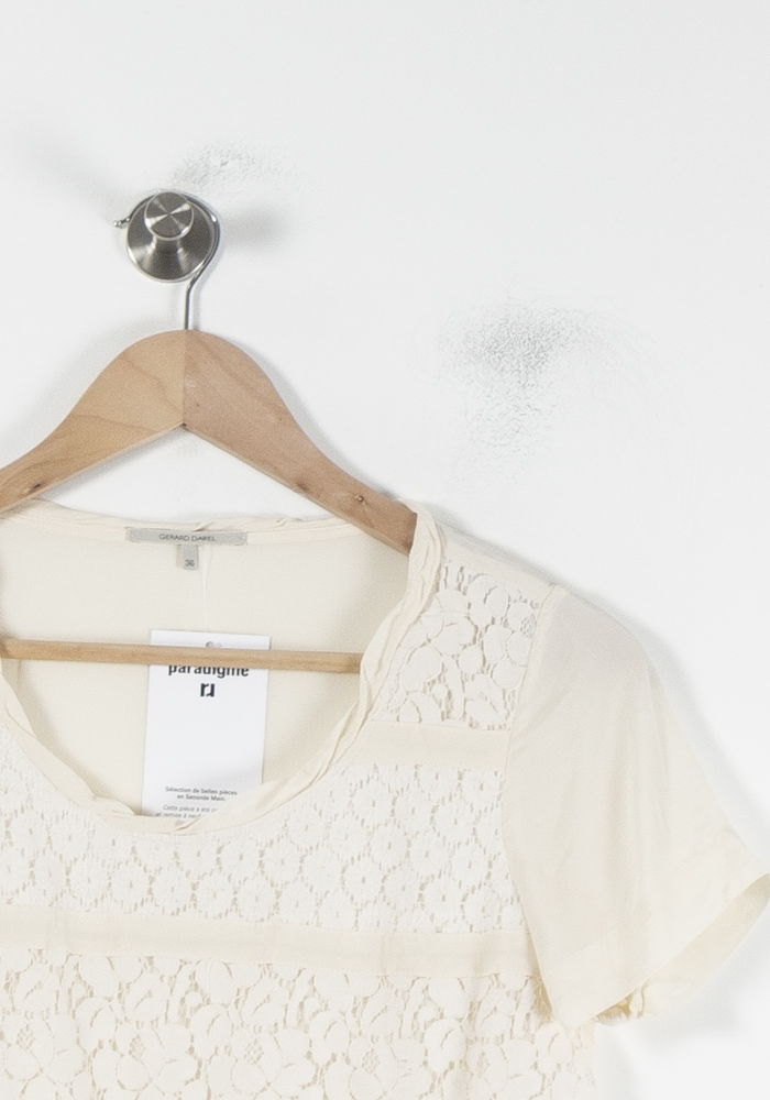 Top blanc Gerard Darel, taille S/36, confectionné avec des empiècements en dentelle sur le devant, apportant une élégance raffinée à ce modèle iconique de la marque. La matière délicate de la dentelle, associée à des manches courtes et un col rond, confère à ce haut un charme unique et féminin tout en le rendant subtil et polyvalent. Ce top se porte idéalement lors d’un déjeuner printanier ou pour une sortie élégante entre amis.