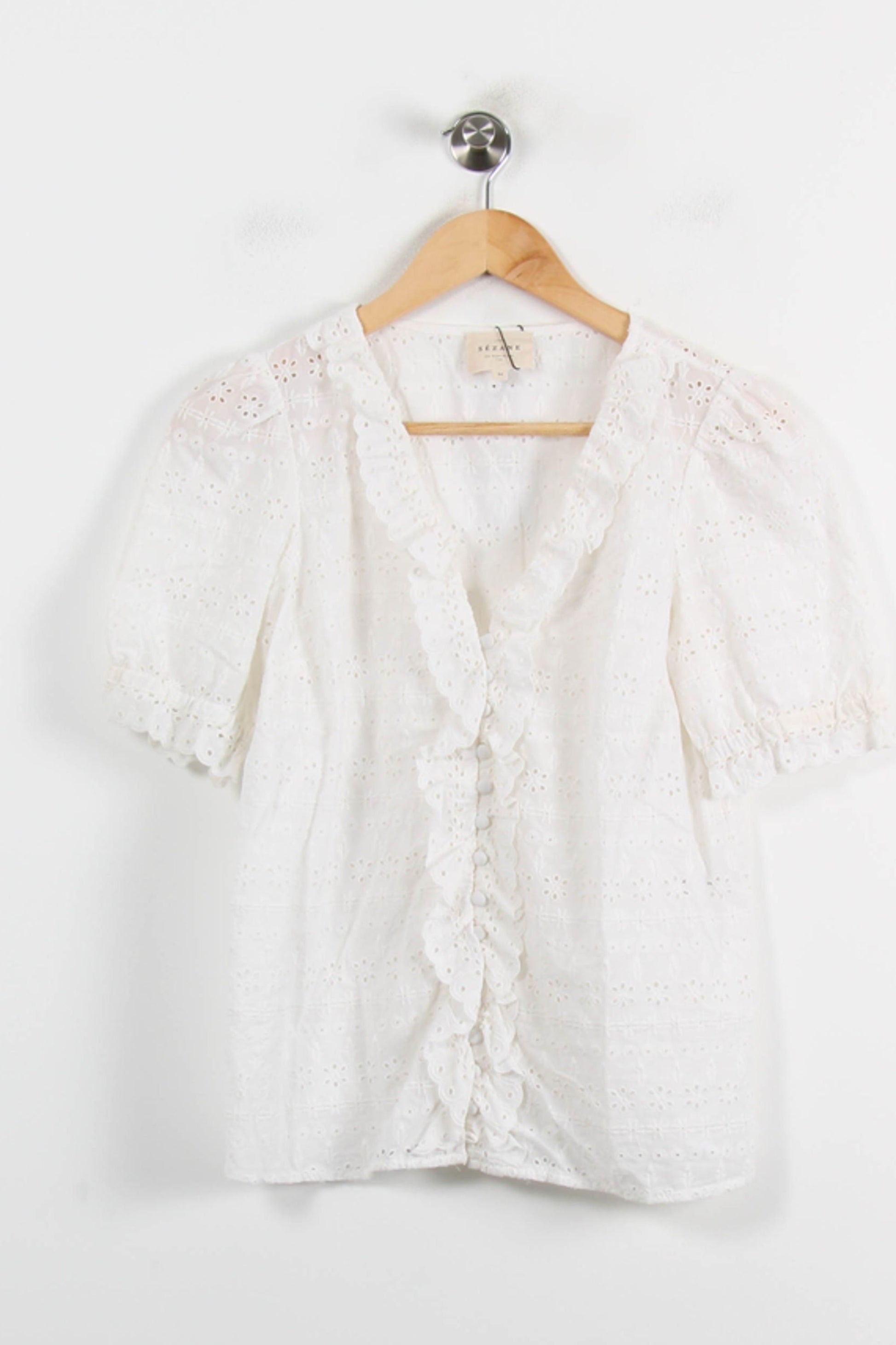 Top blanc Sézane en taille XS/34, délicatement travaillé avec une patte de boutonnage ornée de volants. Ce top se distingue par sa broderie anglaise ajourée et ses manches courtes légèrement bouffantes, soulignées de finitions festonnées, offrant une touche de raffinement unique. Parfait pour une journée estivale ou un déjeuner élégant en terrasse.