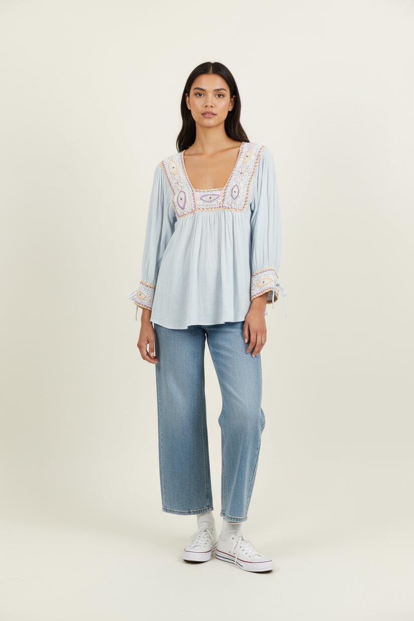 Top multicolore Antik Batik en taille XL/42, à manches longues, orné d’un empiècement brodé contrastant au niveau de l’encolure et des poignets. Confectionné en 100% coton, ce haut se distingue par ses détails crochetés et ses broderies délicates dans des tons violets, jaunes et écrus qui lui apportent une touche artisanale unique. Idéal pour une journée estivale décontractée ou une sortie bohème chic.