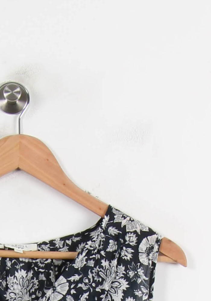 Top sans manches à motif fleuri bleu et blanc, taille XS/34, de la marque Caroll. Ce modèle est confectionné dans une matière légère et fluide, sublimée par un imprimé floral raffiné qui confère à ce top un caractère élégant et intemporel. Idéal pour une journée estivale ou une sortie décontractée entre amis.