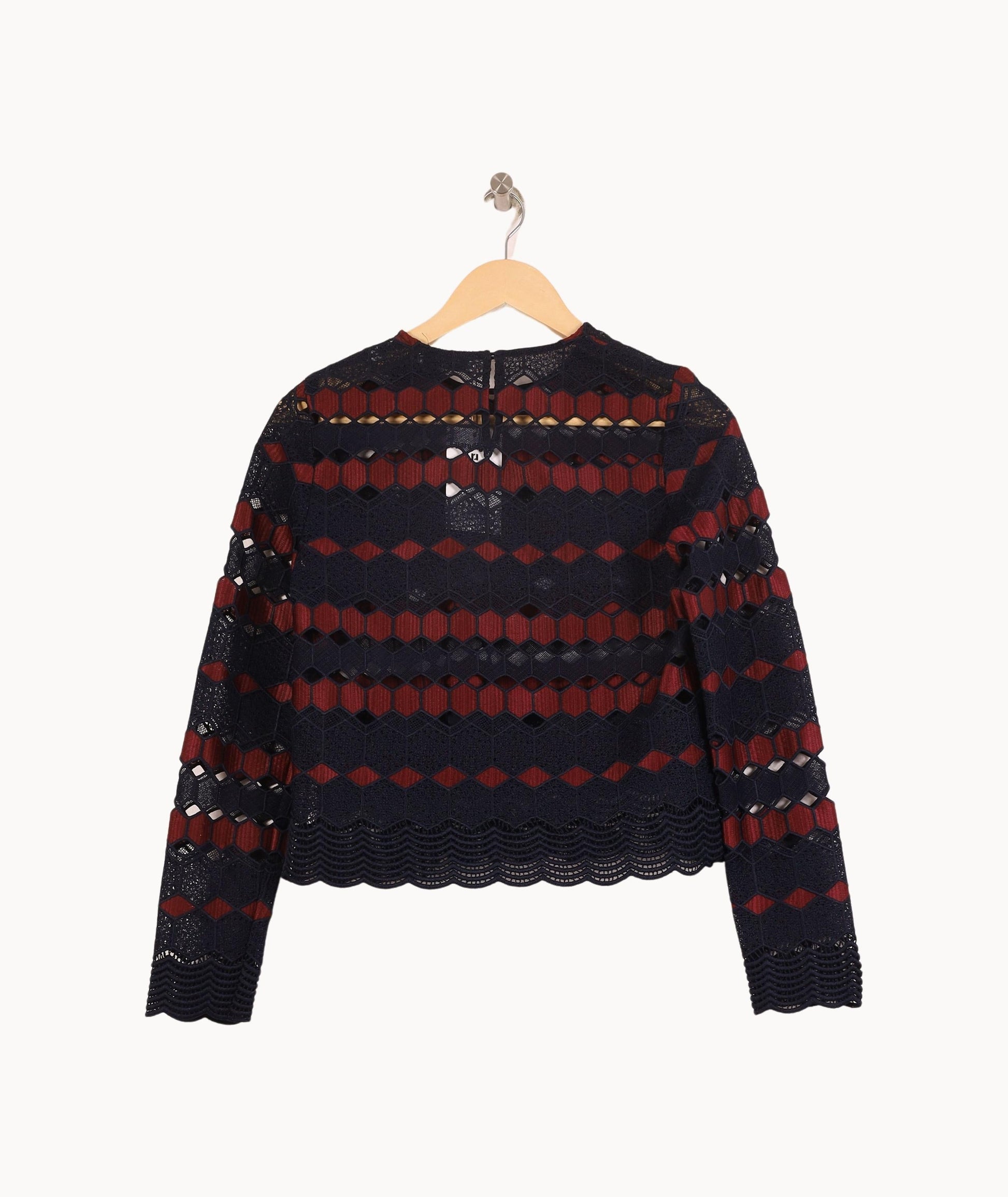 Top Sandro bleu à motifs ajourés, taille S/36, confectionné dans une maille délicate aux finitions raffinées. Ce modèle se distingue par sa dentelle géométrique aux jeux de transparence bleue et bordeaux et son élégant ourlet festonné, lui conférant une allure sophistiquée et contemporaine. Idéal pour un dîner élégant ou une sortie habillée, porté avec un pantalon chic ou une jupe taille haute.