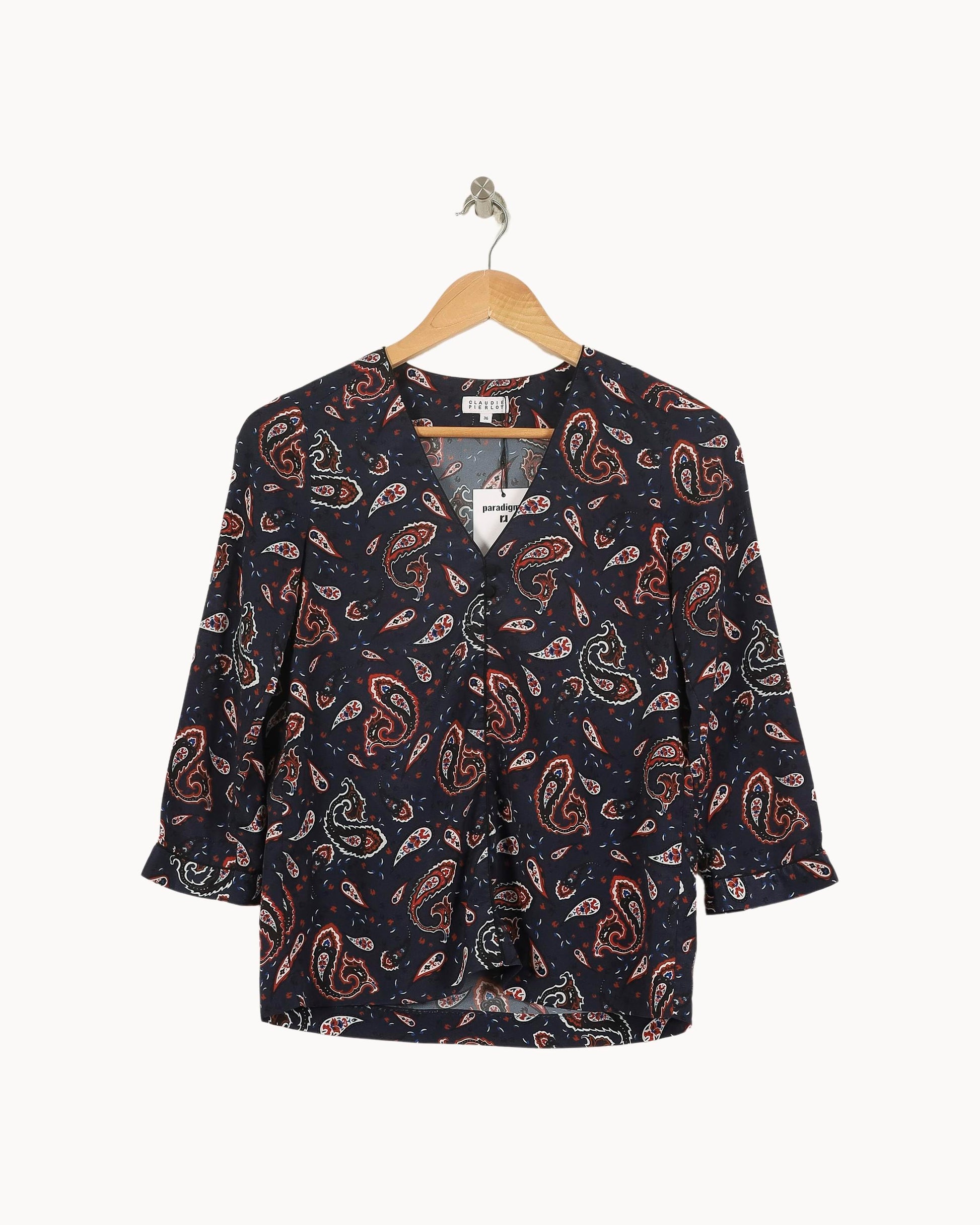 Blouse bleu à motif cachemire Claudie Pierlot, taille S/36, pour une allure sophistiquée et élégante. Confectionnée dans une matière fluide et légère, cette pièce se distingue par son imprimé paisley raffiné et son encolure en V subtilement boutonnée, qui lui confèrent une touche d’originalité et de modernité. Idéale pour une journée de travail ou un déjeuner chic, cette blouse apportera une note de caractère à votre tenue.