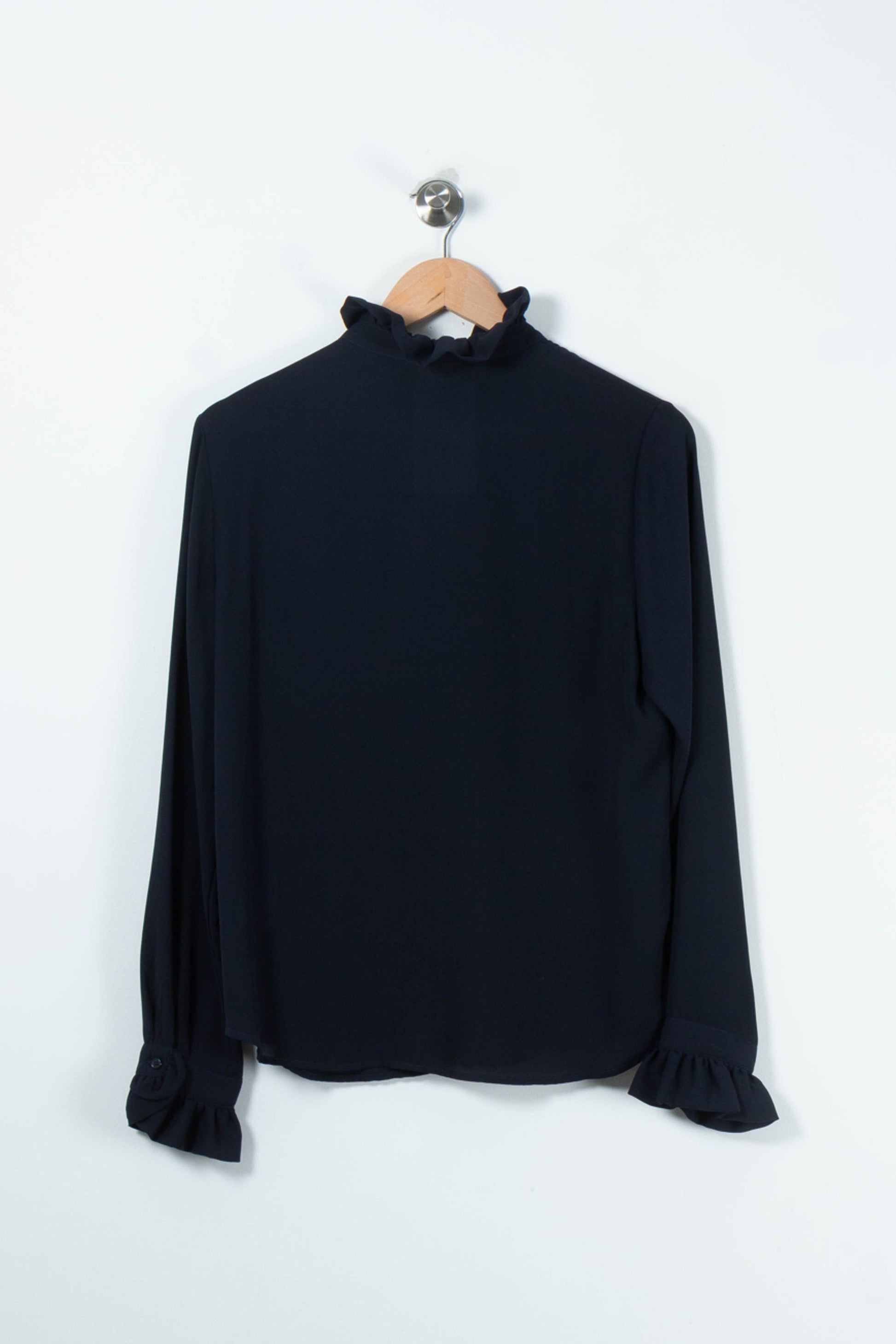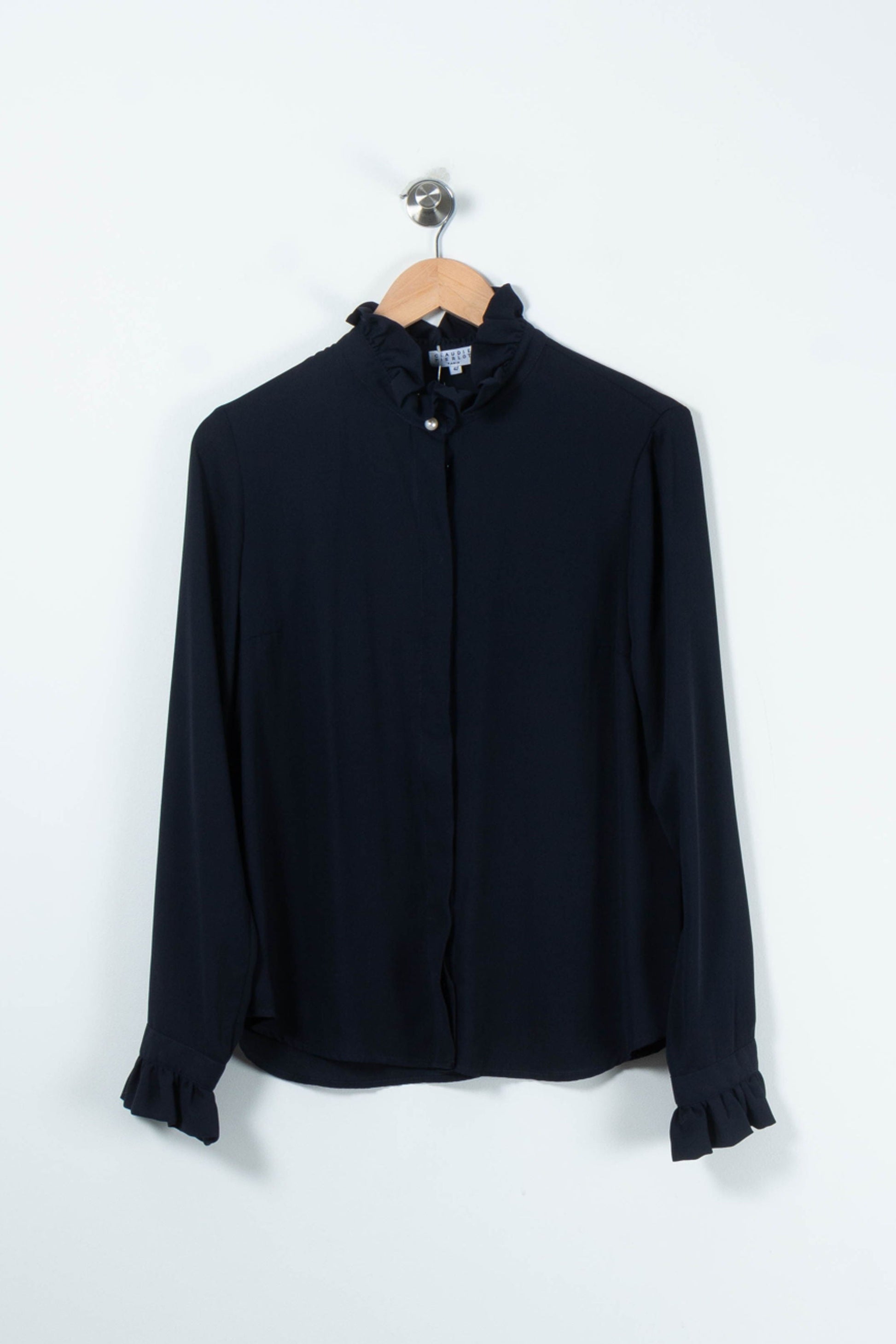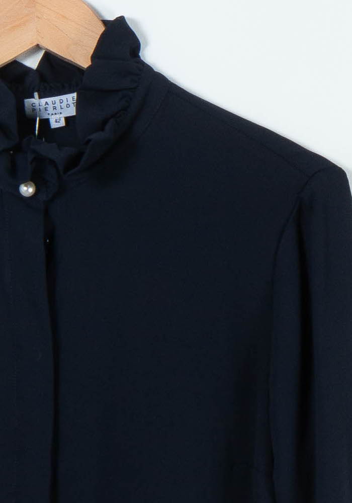 Blouse bleu Claudie Pierlot, taille XL/42, à manches longues et col montant volanté, idéale pour une allure sophistiquée. Confectionnée en 100% polyester, elle se distingue par ses élégants détails de volants au col et aux poignets, ainsi qu’un bouton nacré sur le col, qui en font une pièce unique et raffinée. Parfaite pour un rendez-vous professionnel ou une soirée élégante, cette blouse apporte une touche chic à toutes vos tenues.