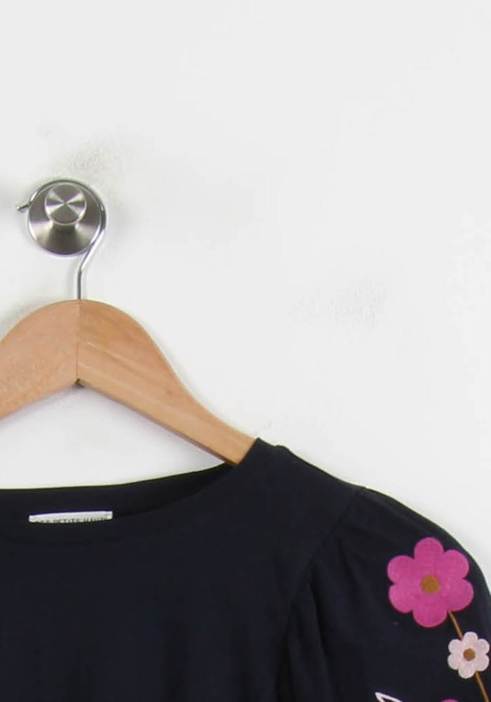 Top bleu à manches longues ballon, broderies florales, taille XS/34, Des Petits Hauts. Confectionné dans une matière fluide et douce, ce modèle se distingue par ses délicates broderies florales aux épaules, harmonieusement colorées, apportant une touche d’originalité et de féminité à la silhouette. Idéal pour une journée au bureau associée à un jean ou une occasion conviviale entre amis.
