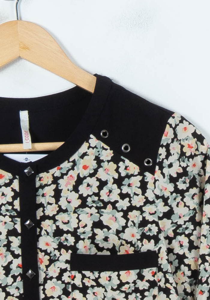 Top fleuri multicolore I.Code taille XS/34, à manches longues et détails contrastés noirs sur les épaules et la patte de boutonnage. Confectionné en 100% polyester, ce haut séduit par son imprimé fleuri lumineux et ses œillets métalliques au niveau des épaules, offrant une touche d'originalité et un style moderne. Parfait pour un déjeuner entre amis, il apporte une note élégante et raffinée à votre tenue.