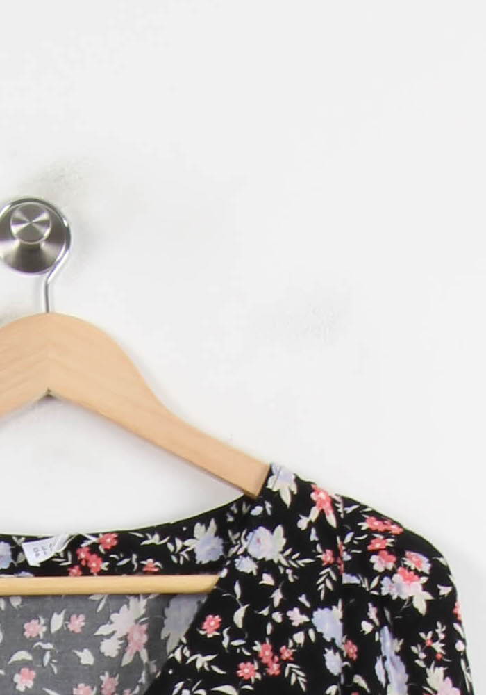 Blouse fleurie Claudie Pierlot, taille M/38, en coloris noir à imprimé floral multicolore. Confectionnée dans une matière légère et fluide, cette blouse est sublimée par un motif de petites fleurs dans des tons doux et féminins, un col en V flatteur et des manches longues légèrement bouffantes, offrant une allure raffinée et romantique. Idéale pour un rendez-vous professionnel ou un déjeuner en terrasse, elle apporte une touche chic et élégante à toutes vos tenues.