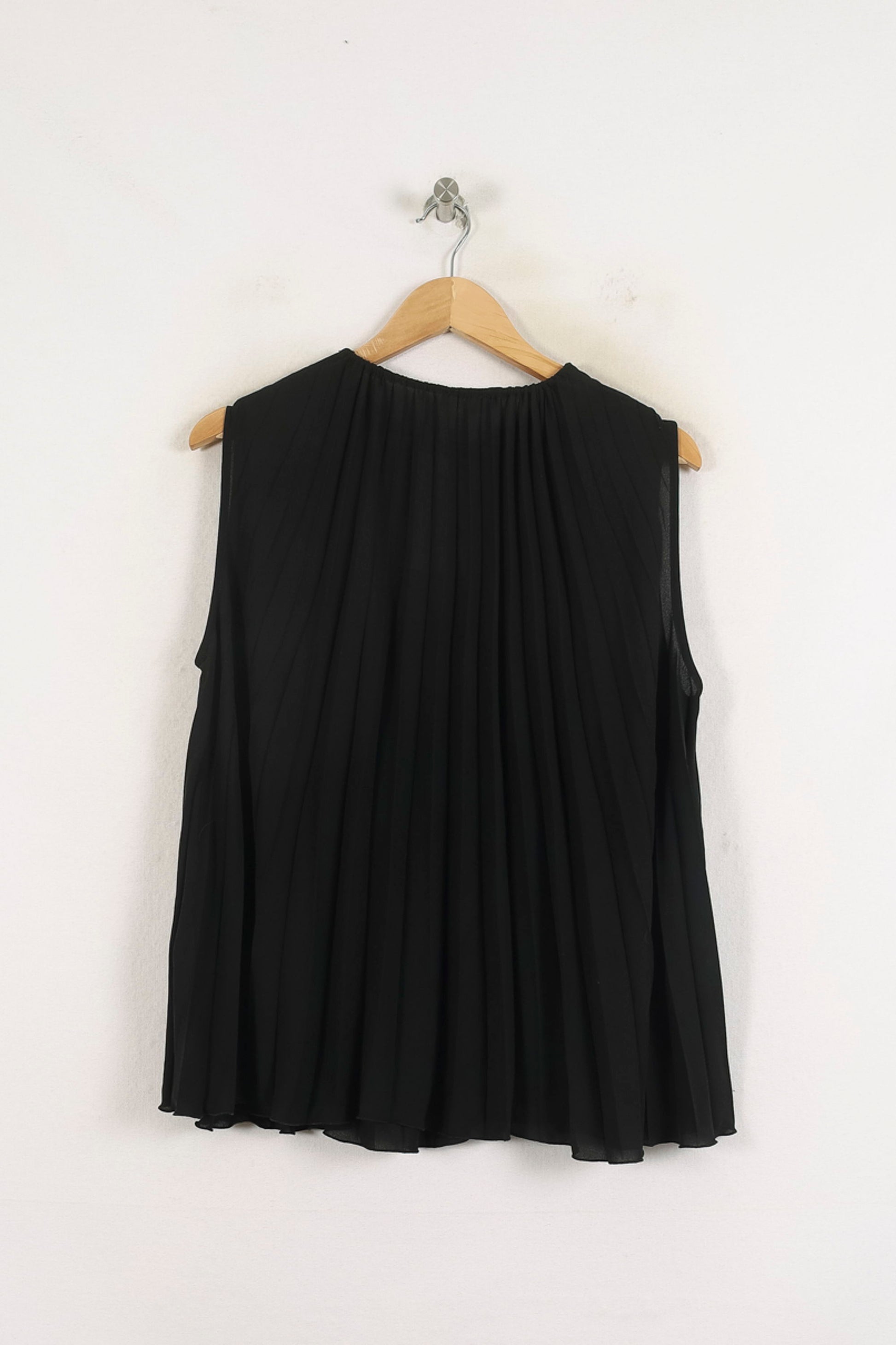 Top plissé noir sans manches Liu Jo, taille XL/42, élégance et modernité signées par la marque. Confectionné dans une matière fluide, il séduit par son tombé aérien, son plissé raffiné et son encolure ornée d’un lien à nouer agrémenté de détails délicats, conférant au vêtement un caractère unique et sophistiqué. Idéal pour une soirée estivale ou un événement chic, ce top s’associe parfaitement à un pantalon habillé ou une jupe élégante.