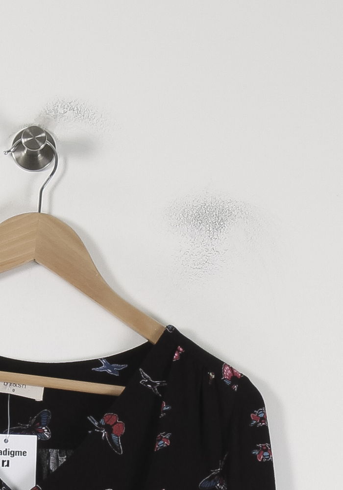 Top noir à motifs papillons ba&sh, taille XS/34 – Élégant haut à manches longues, parfait pour une silhouette féminine et moderne. Confectionné en 100% viscose, ce top séduit par la légèreté de sa matière, associée à de délicats motifs papillons multicolores qui lui confèrent une touche raffinée et singulière. Idéal pour une journée au bureau ou une sortie entre amis, il saura rehausser toutes vos tenues avec style.