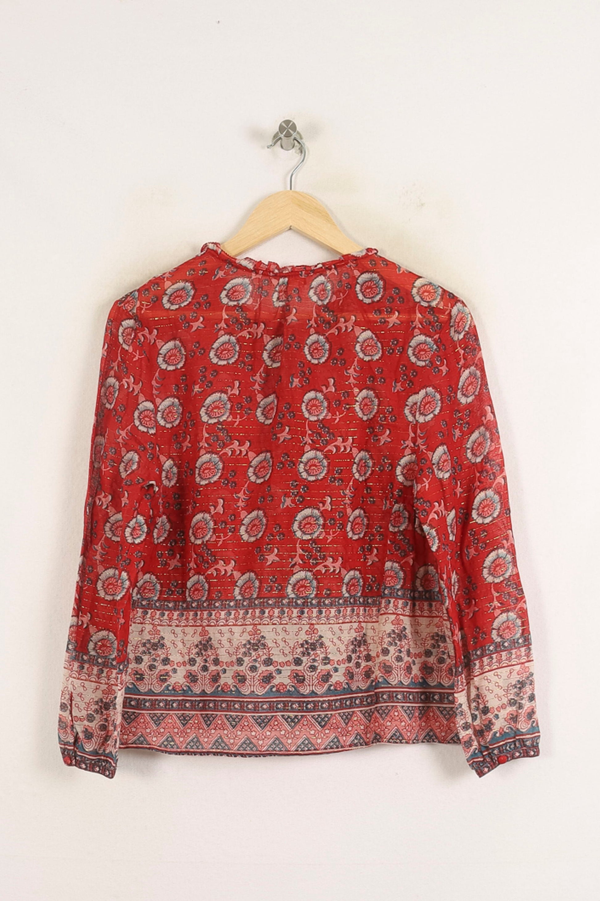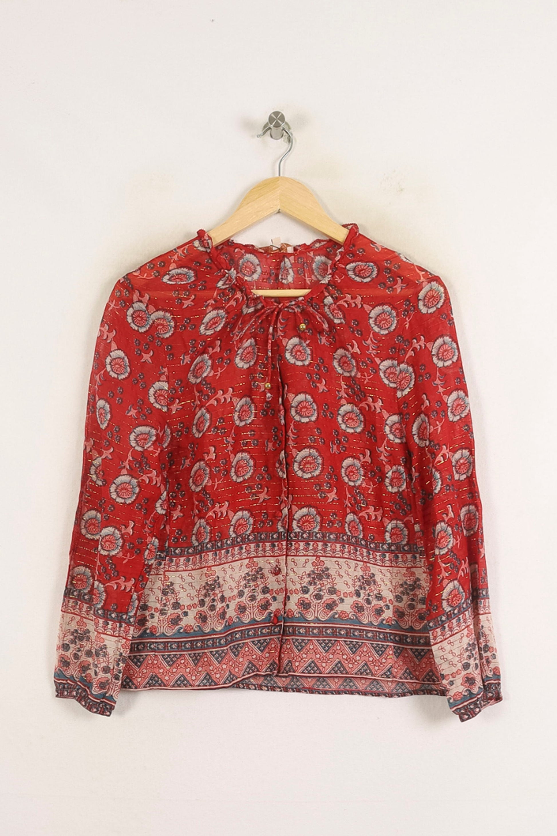 Top à motif fleuri rouge Louise Misha, taille S/36, élégant et raffiné, parfait pour sublimer votre silhouette. Confectionné dans une matière légère, ce haut se distingue par ses imprimés délicats, son encolure froncée et ses poignets boutonnés, offrant une touche bohème et sophistiquée. Idéal à porter lors d’un déjeuner entre amis ou pour une sortie citadine décontractée.