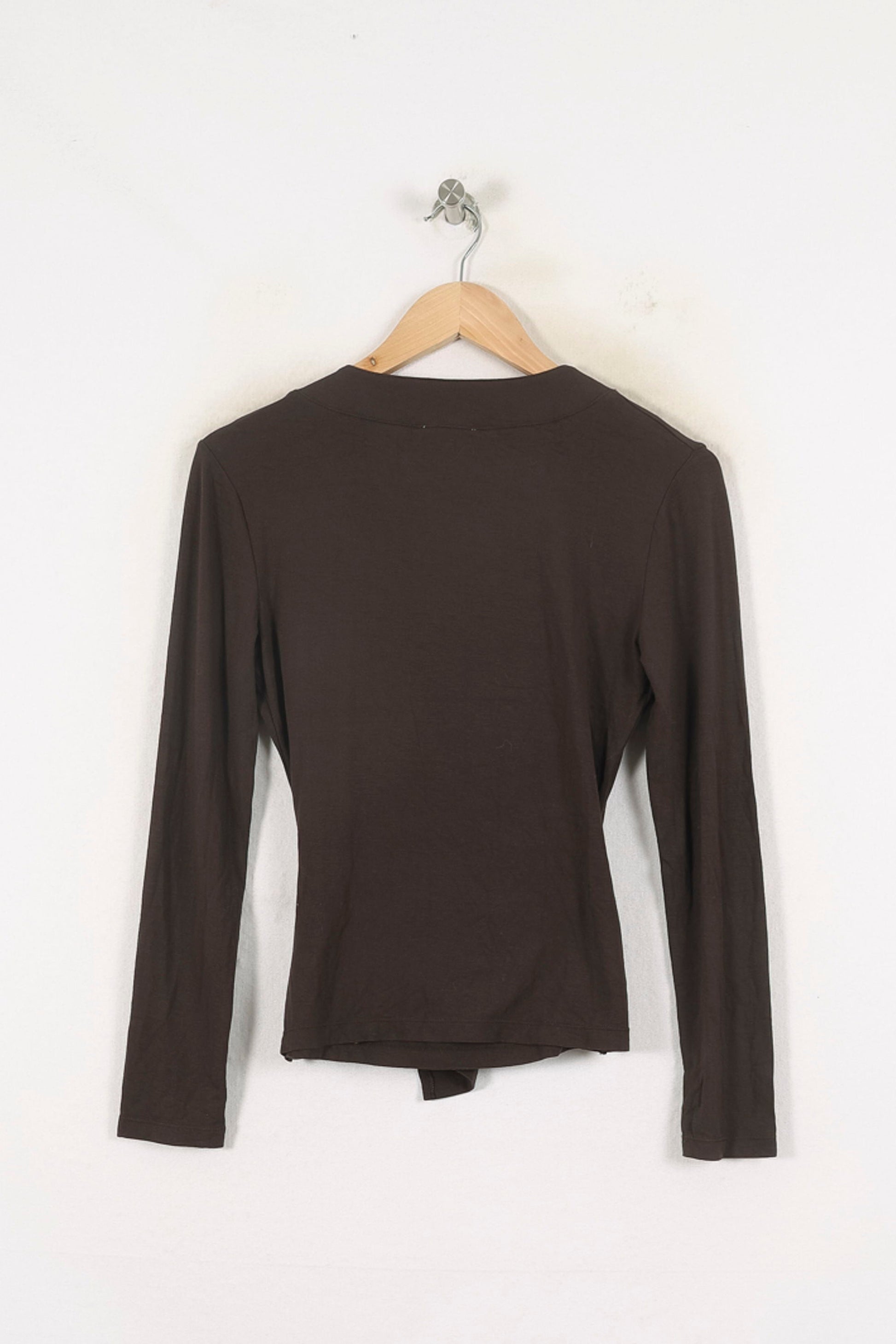 Top cache-cœur marron Maison 123, taille S/36 : ce haut à manches longues séduit par sa coupe élégante et son coloris profond. Confectionné dans une matière douce offrant un tombé naturel, il se distingue par ses ornements subtils brodés de perles et son nœud à la taille, détails raffinés qui rendent ce modèle unique. Parfait pour sublimer une tenue décontractée lors d’un déjeuner en ville ou pour apporter une touche sophistiquée à une soirée entre amis.