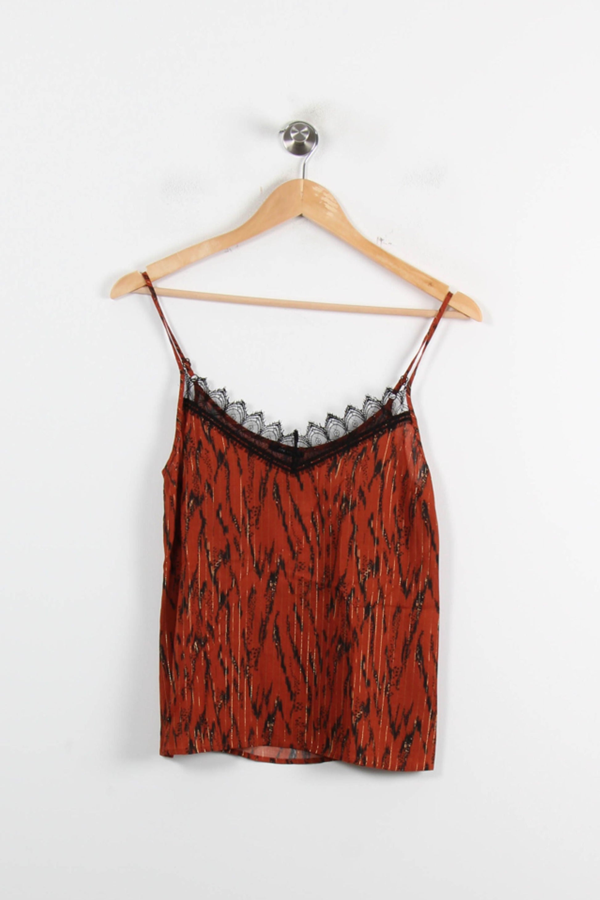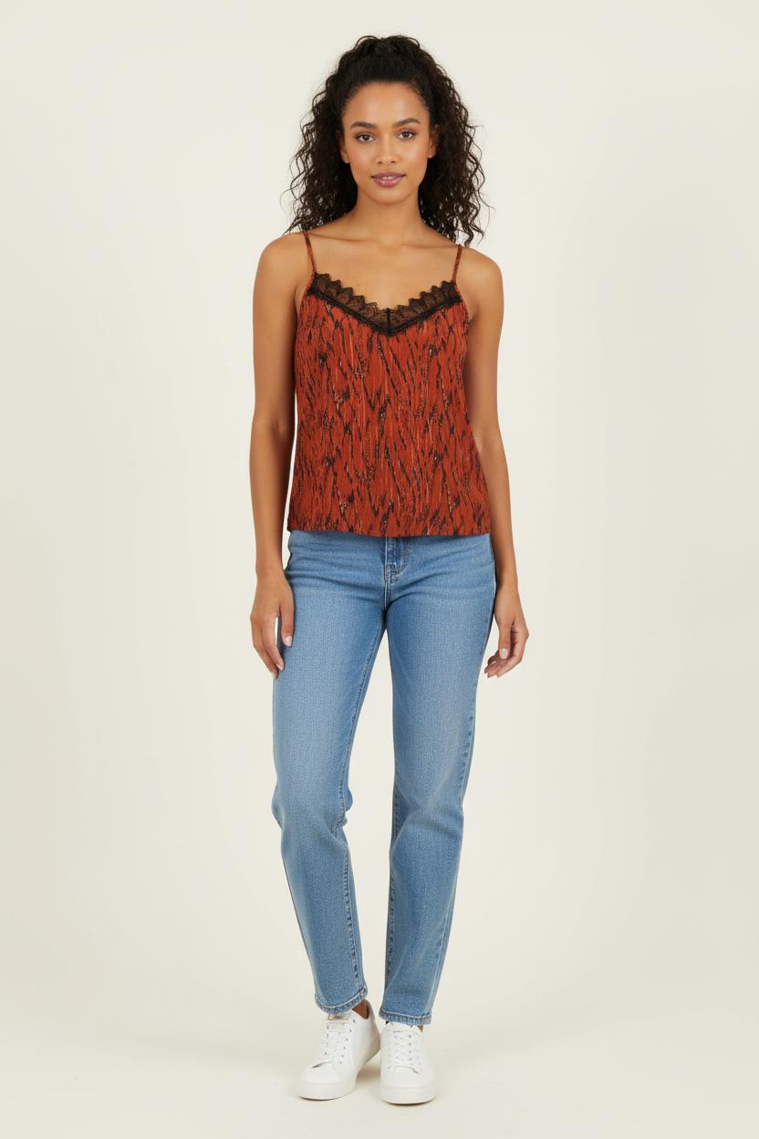 Top à fines bretelles One Step, taille S/36, en coloris marron avec motifs abstraits et détails de dentelle noire. Confectionné dans une matière fluide et légère, ce top se distingue par son imprimé original et son encolure délicatement soulignée de dentelle, apportant une touche de féminité singulière. Idéal pour une soirée estivale accompagnée d’un pantalon élégant ou une occasion festive.