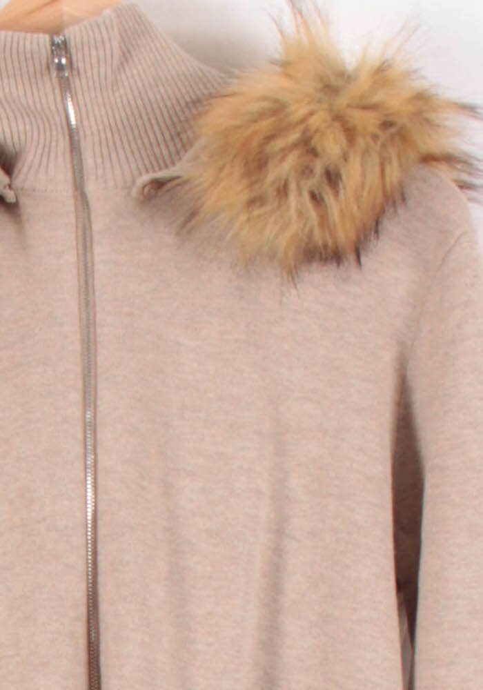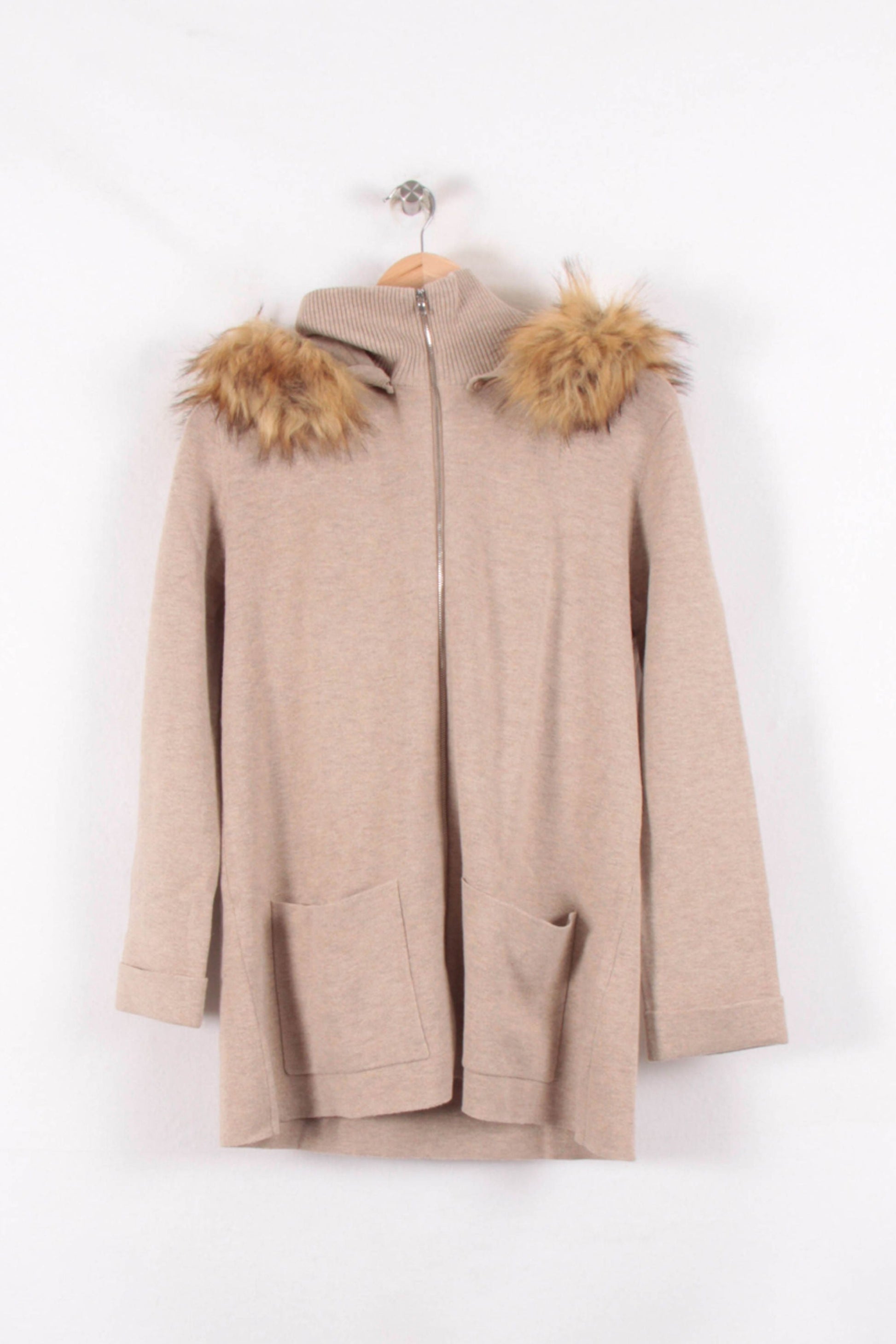 Gilet zippé beige ZAPA, taille S/36, avec col montant et empiècements en fausse fourrure sur les épaules. Confectionné dans une maille douce, il se distingue par ses poches plaquées à l'avant et l'élégance de son col orné de fausse fourrure, apportant une touche sophistiquée et chaleureuse. Idéal pour sublimer une tenue décontractée lors d'une journée hivernale en ville ou pour un rendez-vous entre amis.