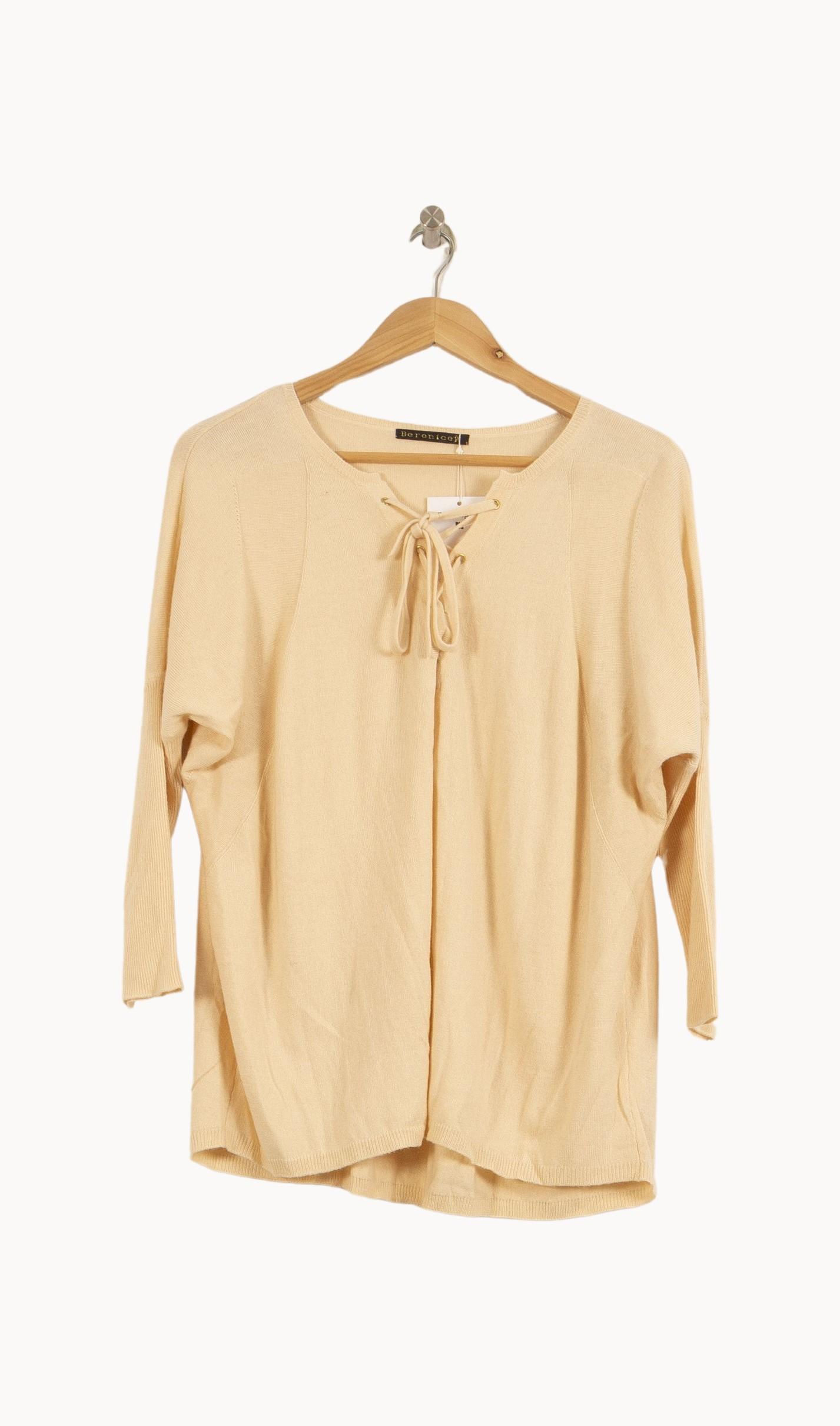 Cardigan beige à manches 3/4 Bérénice, taille S/36. Confectionné dans une maille fine, ce cardigan présente un élégant laçage à l'encolure qui lui confère une touche délicate et raffinée. Idéal pour une journée décontractée au bureau ou un après-midi en ville.